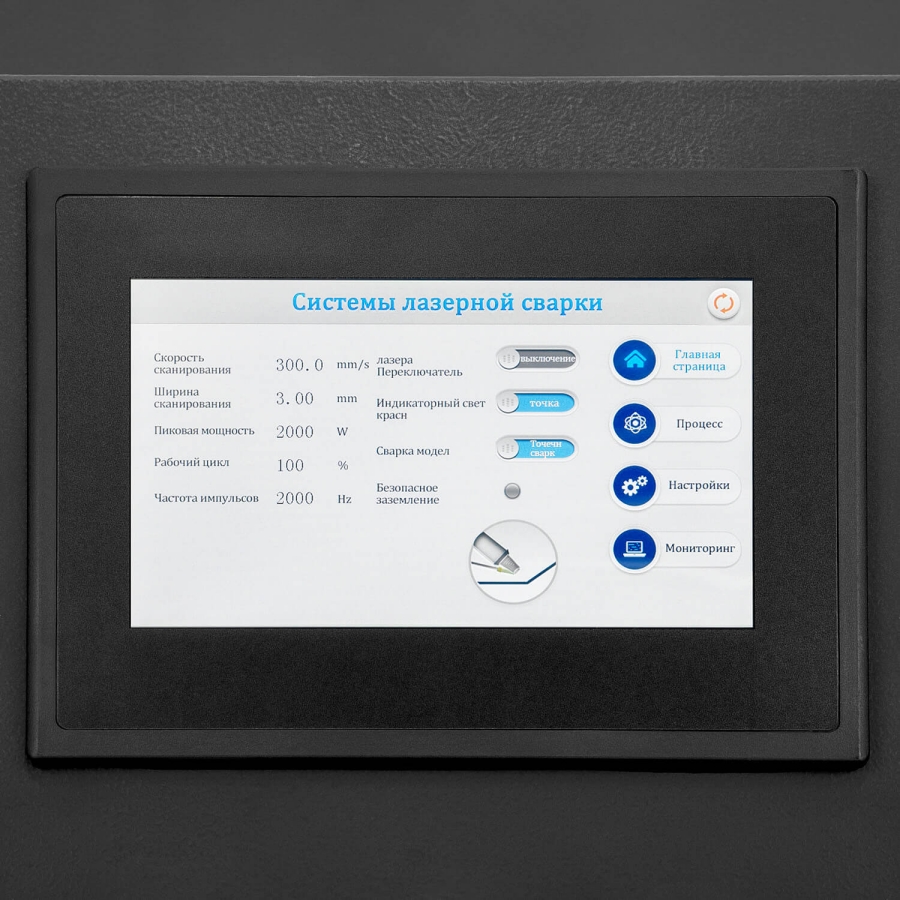 - Головка пистолета оснащена оригинальным оптоволоконным лазером (10 м). Сварочная головка подвижна и удобна в обращении, а на корпусе аппарата предусмотрено специальное крепление для нее.