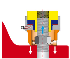 3. Присоединяют насос посредством РВД к домкрату, масло поступает под давлением в полость домкрата, создавая усилие натяжения шпильки.