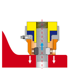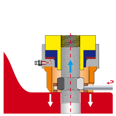 4. По достижении давления, соответствующего требуемому усилию затяжки, гайку закручивают вращением обоймы от руки при помощи воротка через отверстие в стенке проставки.