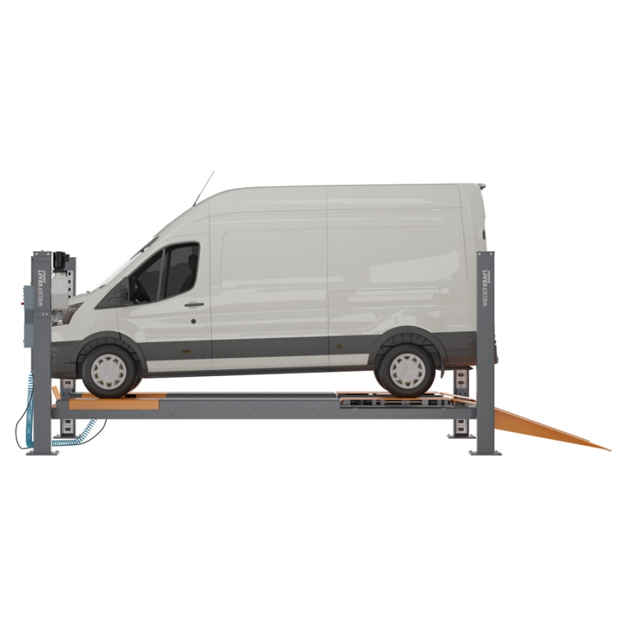 Четырехстоечный гидравлический подъёмник WiederKraft WDK-545 грузоподъемностью до 5000 кг. Применяется для регулировки развал-схождения и отличается высокой надежностью конструкции, наличием современной системой защиты от повреждения (кабеля при подъеме, от перегрузки по весу, от повреждения электропроводки). Подъемник модели WDK-545 оборудован двойным устройством безопасности: если замки безопасности у платформ не сработают, подъемник будет автоматически заблокирован дублирующим устройством. Пневматическое управление стопорами с центрального пульта и траверсой, изменяемое расстояние колеи, позволяет охватить широкий спектр задач и сделать подъемник универсальным. Эффективная длина подъемника составляет 5100 мм, что позволяет разместить на нем как легковой, так и легкий коммерческий автомобиль. Комплектация подъемника включает в себя траверсу грузоподъемностью 2 тонны и задние сдвижные платформы для измерения геометрии и развал-схождения.