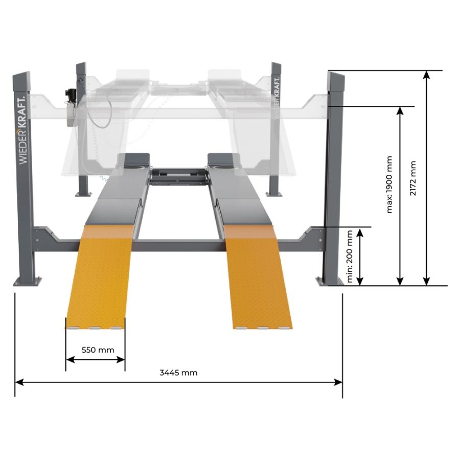 Четырехстоечный гидравлический подъёмник WiederKraft WDK-550 грузоподъемностью до 5500 кг. Применяется для регулировки развал-схождения и отличается высокой надежностью конструкции, наличием современной системой защиты от повреждения (кабеля при подъеме, от перегрузки по весу, от повреждения электропроводки). Подъемник модели WDK-550 оборудован двойным устройством безопасности: если замки безопасности у платформ не сработают, подъемник будет автоматически заблокирован дублирующим устройством. Пневматическое управление стопорами с центрального пульта и траверсой, изменяемое расстояние колеи, позволяет охватить широкий спектр задач и сделать подъемник универсальным. Эффективная длина подъемника составляет 5725 мм, что позволяет разместить на нем практически любой коммерческий транспорт. Комплектация подъемника включает в себя траверсу грузоподъемностью 2,7 тонны и задние сдвижные платформы для измерения геометрии и развал-схождения.