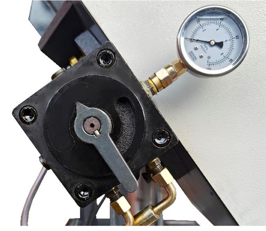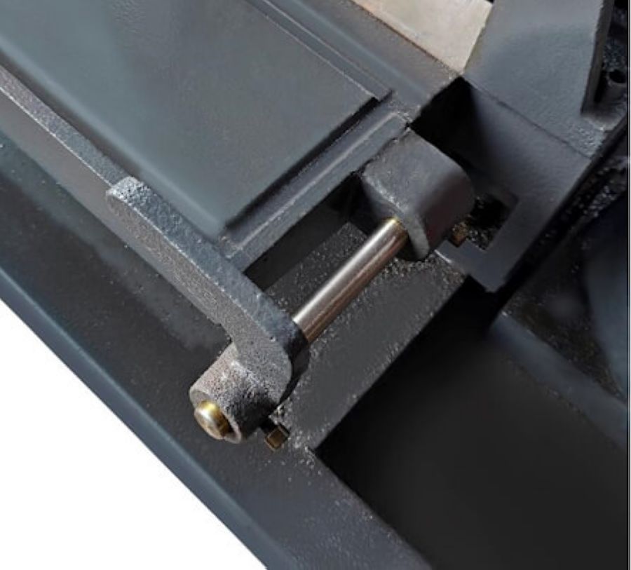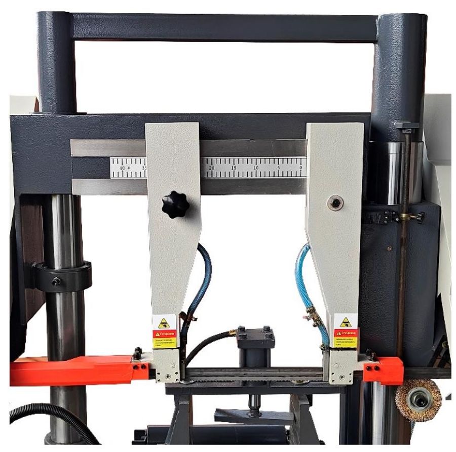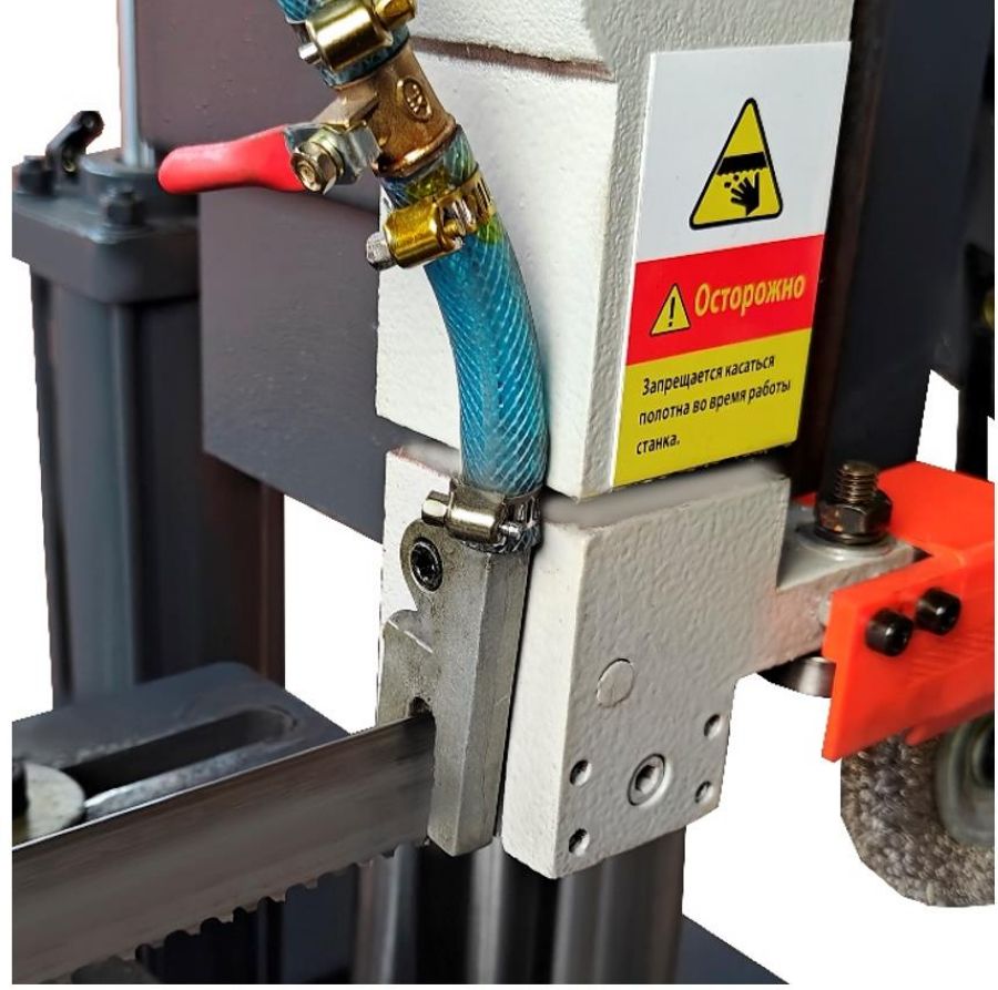 - Гидравлический блок с тензометром для натяжения полотна находится с левой стороны станка, блок позволяет контролировать натяжение полотна и тем самым получать стабильный рез и продлить срок службы полотна.