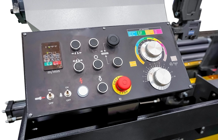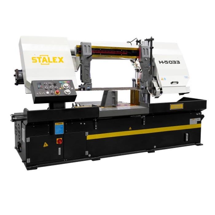 Модель Stalex H-5033 является гидравлическим ленточнопильным станком, колонного типа. Полуавтоматические ленточнопильные станки, предназначены для пиления труб и сплошных заготовок, максимальным диаметром круга и квадратных заготовок под углом 90°. Колонные ленточнопильные станки имеют 2 вертикальные стойки по которым перемещается горизонтальная пильная рама, образуя жёсткий контур с высокой стабильностью реза. Пильная рама, представляет собой стальную сварную конструкцию. На полуавтоматических станках возможна работа как в ручном режиме, когда каждая операция выполняется вручную посредством нажатия соответствующей кнопки, так и в автоматическом режиме, когда станок выполняет весь цикл резания (зажим заготовки – запуск пилы – опускание рамы – остановка пилы – подъем рамы – отжим тисков). В последнем случае оператор должен лишь обеспечить подачу заготовок и нажатие кнопки «Пуск». Особенности: