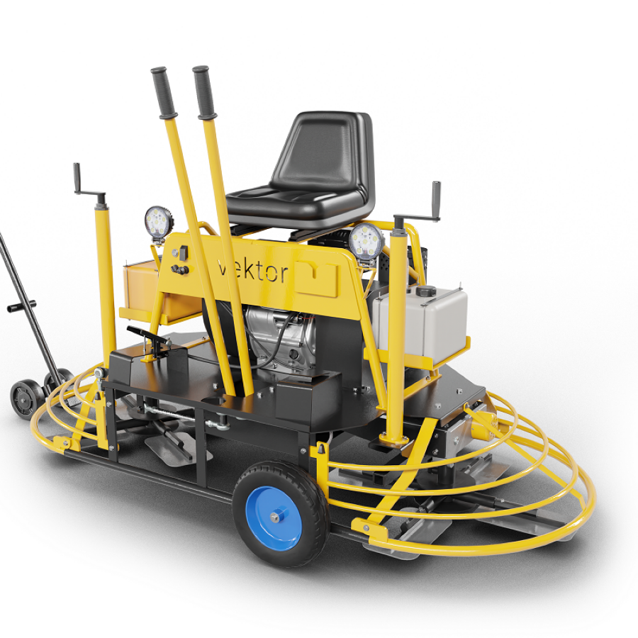 Принцип действия заглаживающей машины (вертолёта) Vektor VTMG-1000B В отличие от однороторной, эта модель оснащена двумя заглаживающими дисками, поэтому за один проход она обрабатывает в два раза большую площадь. Здесь предусмотрено специальное сиденье для оператора, который сидя управляет процессом заглаживания с помощью рычагов. Производительность и эффективность двухроторных машин выше благодаря минимизации ручного труда, большему весу установки и повышенному качеству обработки. Поэтому их используют для работ в промышленных объемах. Рабочий инструмент заглаживающих машин — металлические лопасти и диски. С помощью диска выполняется заглаживание бетонной смеси. Она становится более ровной, относительно шероховатой и нескользкой. Для повышенной прочности поверхности заглаживание проводят дважды. Лопастями проводят затирку — финальный этап обработки пола. Её нужно проводить по бетону, к которому уже не прилипает рука, но от которого еще идет испарение влаги. Тогда на поверхности не останется следов лопастей, пузырей воздуха и других дефектов. На модель VTMG-1000 устанавливаются диски диаметром до 1000 мм.