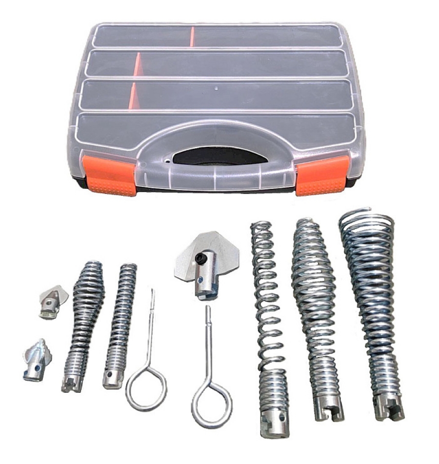 - Комплектующие для спиралей 22 мм: Разъединительный ключ для прочистных насадок и спиралей 22 мм, Прямая насадка, Грушевидная насадка, Конусообразная насадка, Изогнутый лопаточный бур 5 шт.