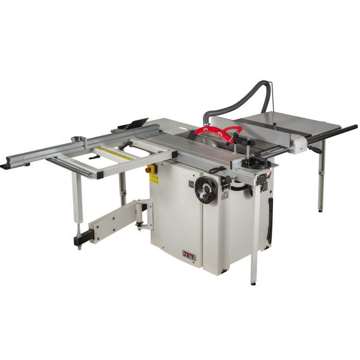 Jet JTSS-1600 форматно-раскроечный станок профессионального класса для работы с древесиной и ламинированными материалами на её основе. Важная особенность данной модели в том, что уже с завода она укомплектована большинством вспомогательных узлов, которые обычно приходится докупать. Рабочий стол выполнен из чугунного литья, его можно расширить одной или двумя секциями. Первым ставится чугунный расширитель, к нему можно пристыковывать сегмент из стального листа, оборудованный опорой. Такая база позволяет распиливать детали с отступом 1220 мм от параллельного упора. Сам упор выполнен по классической для профессиональных станков схеме: крепится к массивному чугунному основанию, которое перемещается по цилиндрической направляющей и фиксируется эксцентриковым стопором.