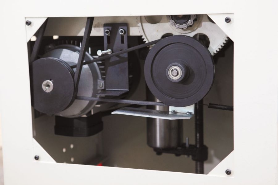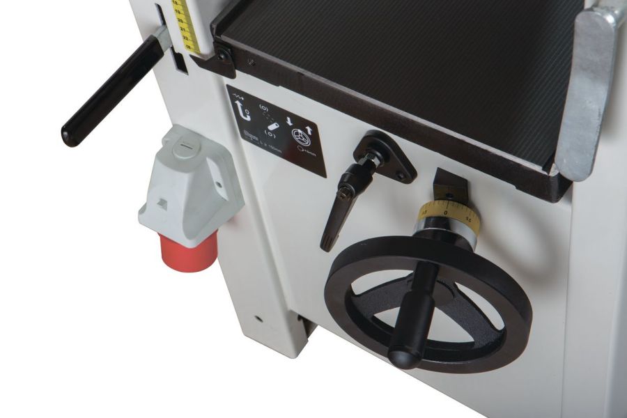 Фугование и рейсмусование производятся как обычно – каких-либо специальных приемов работы не требуется; переналадка почти не занимает времени. Верхний фуговальный модуль, объединяющий в себе оба стола и механизм регулировки глубины строгания, полностью откидывается (при этом ранее сделанные настройки не сбиваются), кожух стружкоудаления переворачивается. Компоновка с откидным верхом дает преимущества как в работе (лучше обзор, более качественно работает стружкоудаление), так и при обслуживании строгального вала, доступ к которому ничем не затруднен.