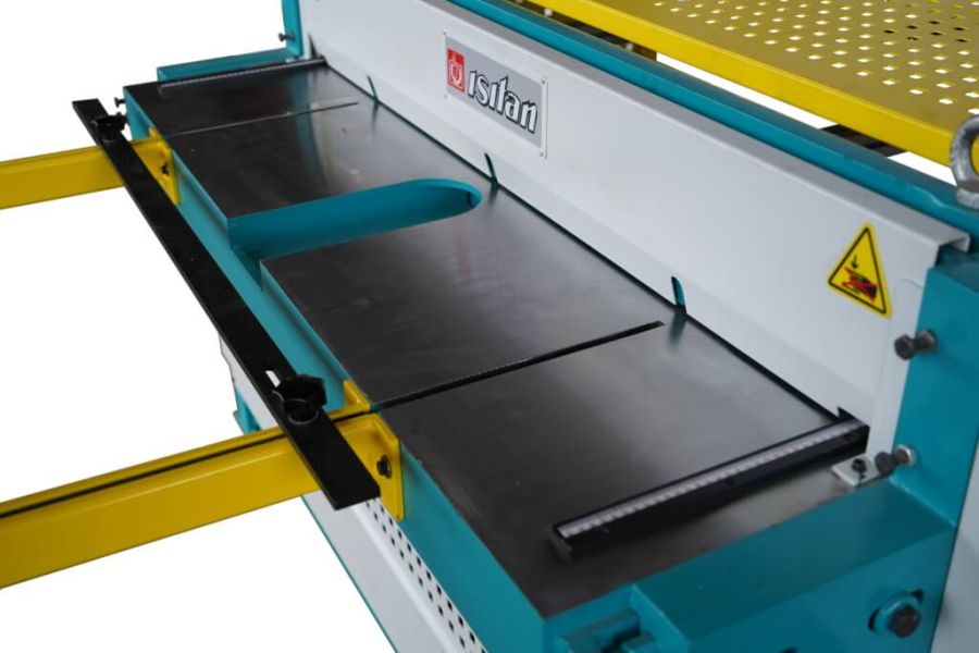 Станок оснащен передней поддержкой листа, задний стол имеет возможность регулировки для резки под углом.