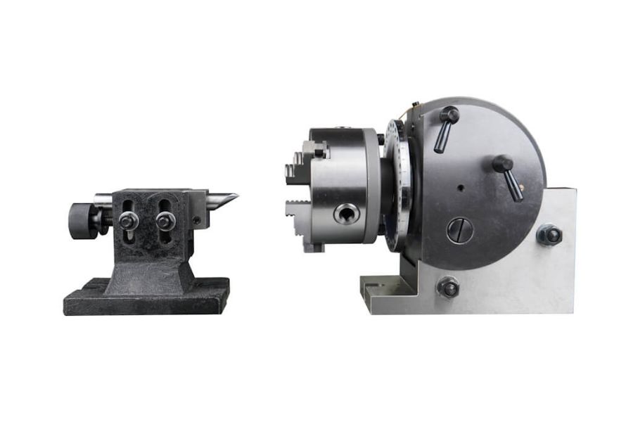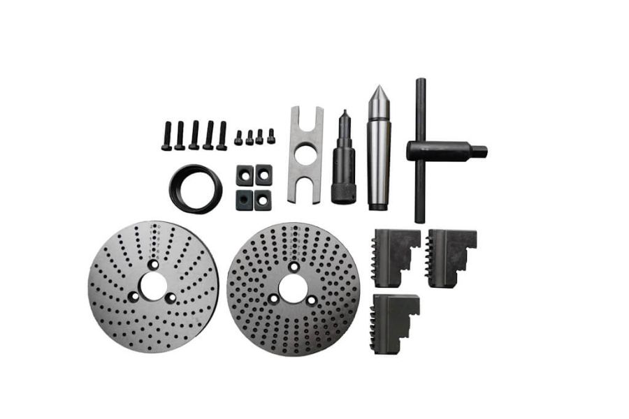 - В стандартную комплектацию входят 3 делительных диска, неподвижный упор, обратные кулачки, 3-кулачковый патрон O125 мм, задняя бабка.