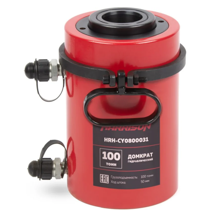 Harrison HRH-CY0800031 гидравлический домкрат двухполостной с полым штоком, грузоподъемность 100 т., ход штока 50 мм. Используется для подъема, перемещения, фиксации различных тяжелых предметов (конструкций) на заданной высоте.
