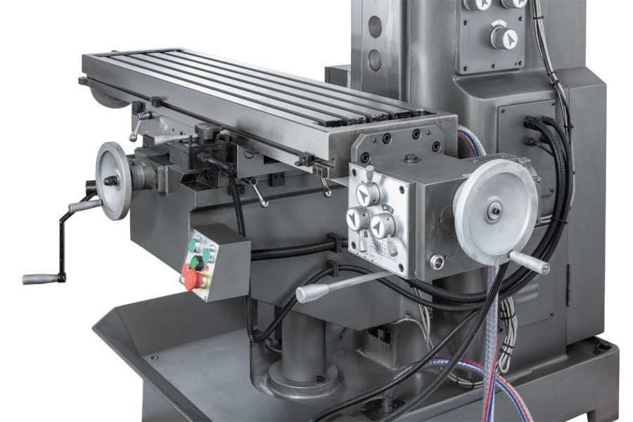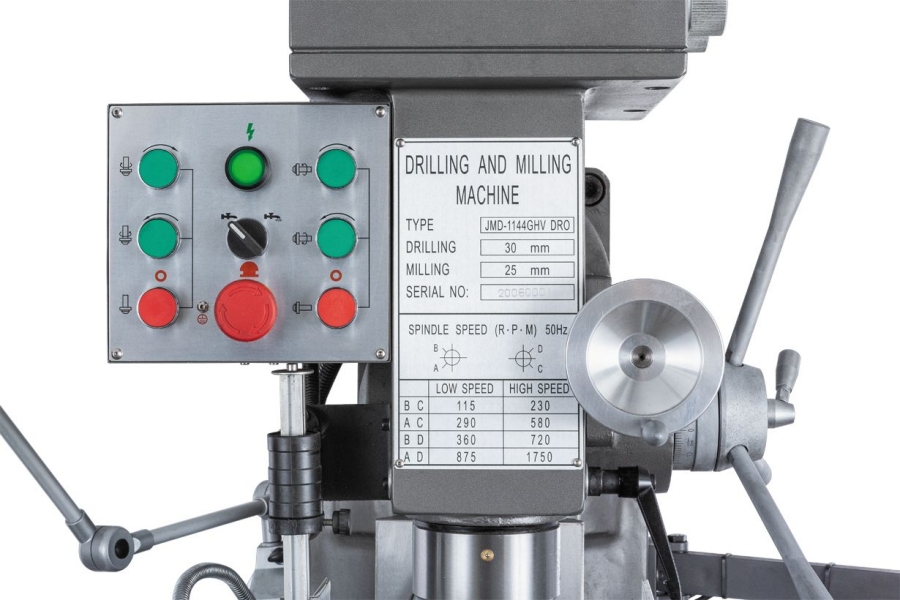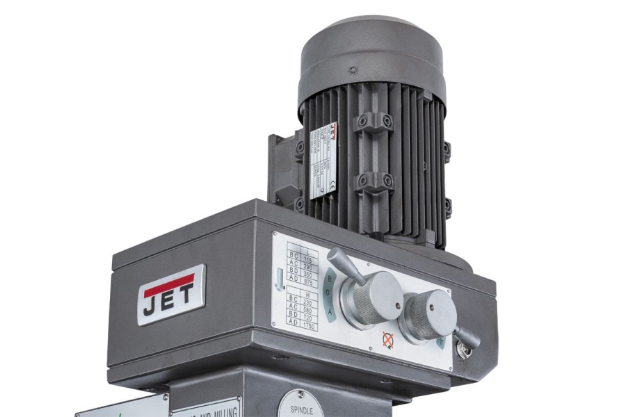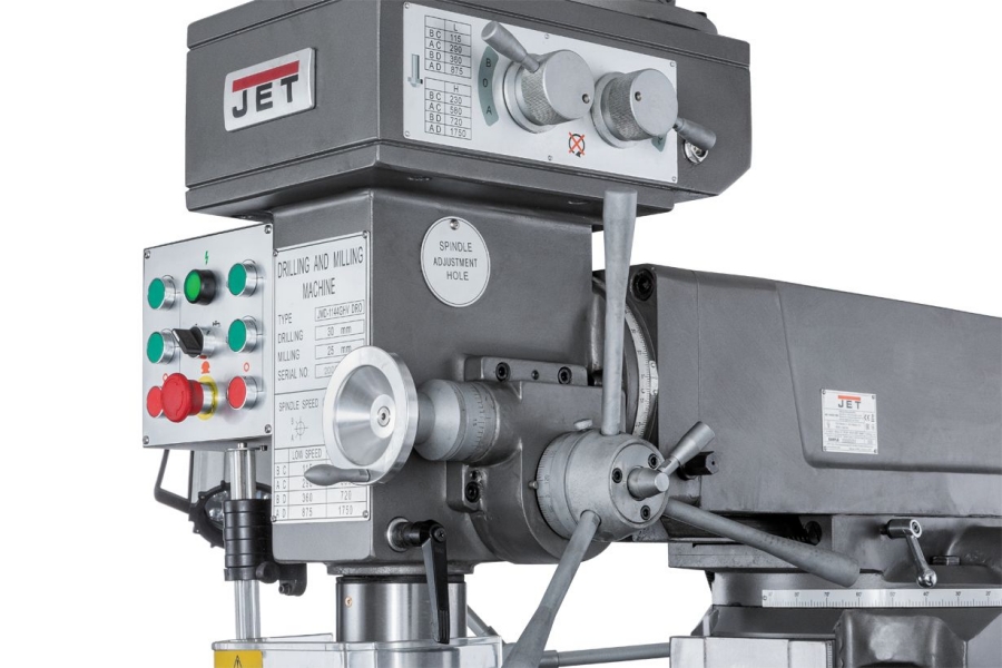 На станке JET JMD-1144GHV DRO можно производить сверление отверстий до диаметра 30 мм и фрезеровать концевыми фрезами до диаметра 20 мм. На станке установлены вертикальный шпиндель мощностью 1,5 кВт и горизонтальный шпиндель 2,2кВт со скоростями вращения в диапазонах 115-1750 и 40-1300 об/мин соответственно. Расстояния между вертикальным шпинделем и столом от 70 до 420 мм, вертикальным шпинделем до колонны от 200 до 650 мм; горизонтальный шпиндель-стол – от 15 до 365мм. Выбор скоростей вертикального шпинделя осуществляется с помощью 8-ми ступенчатой коробки скоростей и имеет предустановленные скорости: 115, 230, 290, 360, 580, 720, 875, 1750 об/мин.