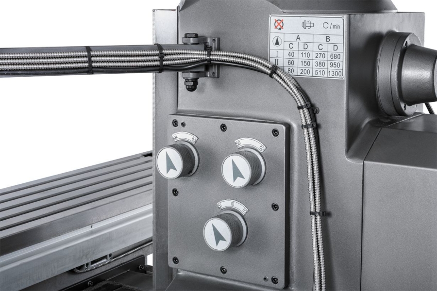 Скорость вращения горизонтального шпинделя изменяется с помощью 12-ти ступенчатой коробки скоростей со следующими значениями: 40, 60, 80, 110, 150, 200, 270, 380, 510, 680, 950, 1300 об/мин.