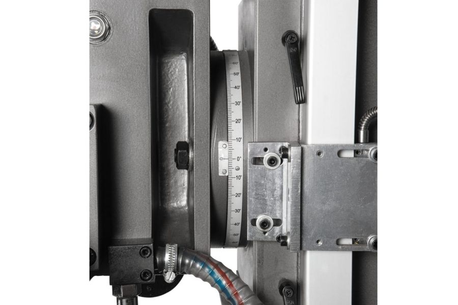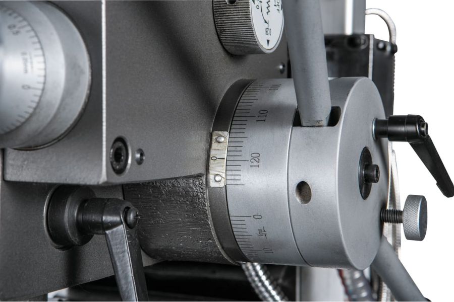 В зависимости от обрабатываемого материала и необходимых режимов обработки, можно выбрать любую из 12 скоростей вращения шпинделя в 2-х диапазонах от 75 до 1600 об/мин и от 150 до 3200 об/мин. Для расширения диапазона обрабатываемых деталей фрезерная голова имеет возможность наклона вправо/влево на 90 градусов.