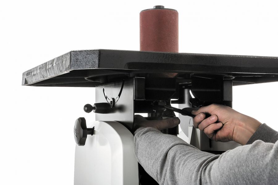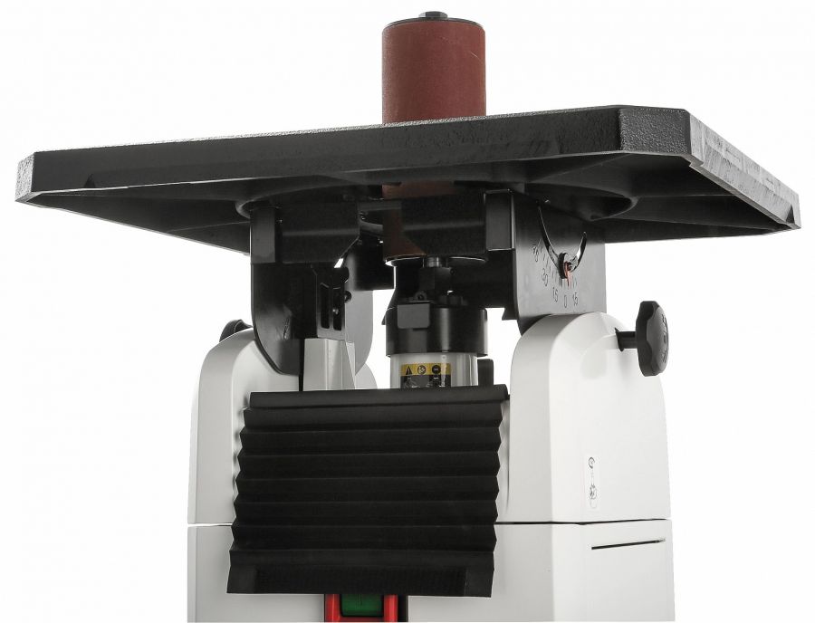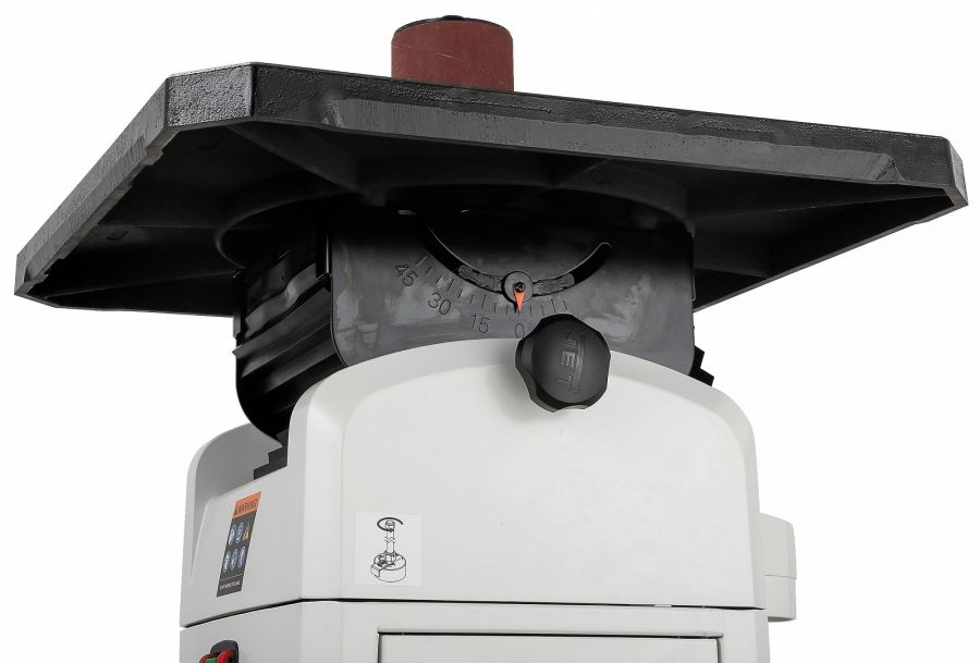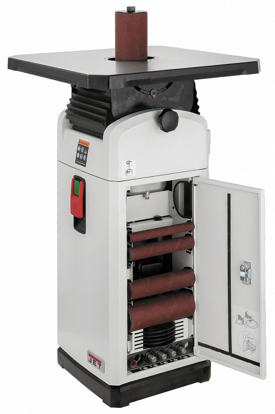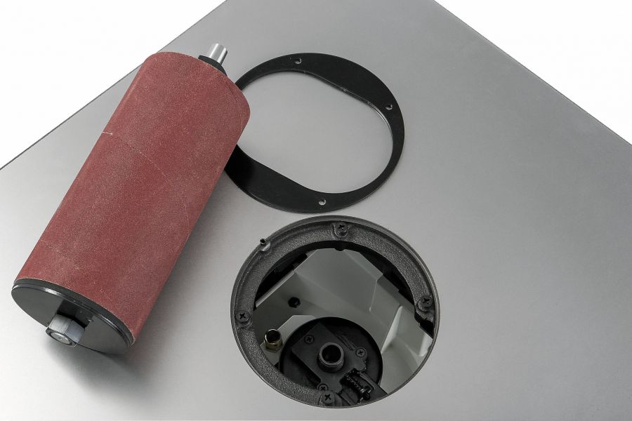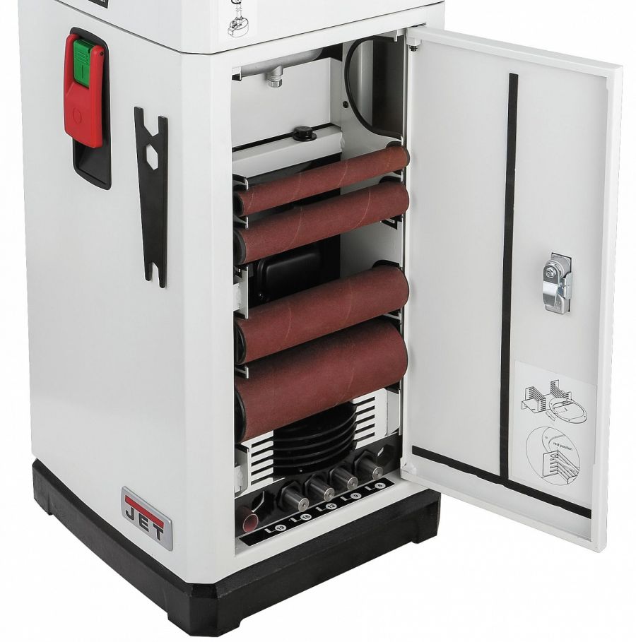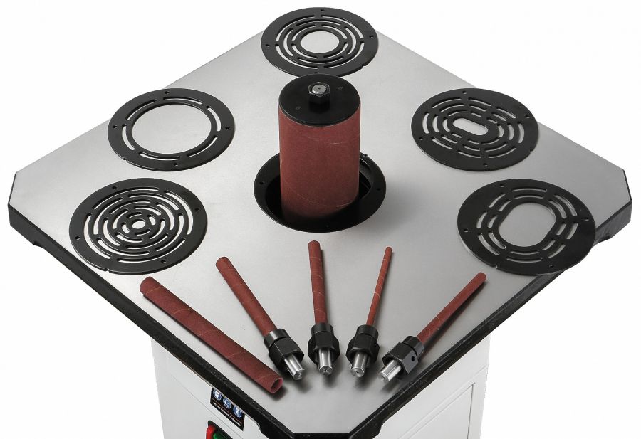 Стандартная комплектация включает в себя 10 шлифовальных шпинделей с диаметром от 6 до 100 миллиметров, а также кольцевые вставки в рабочий стол с круглым и овальным отверстием (для работы в наклонном положении стола). Расходный материал – абразивные гильзы – предлагаются со склада Jet в широком ассортименте.