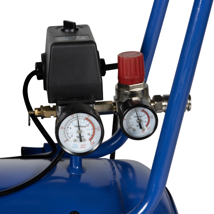 Объем ресивера обеспечивает продолжительную и эффективную работу. Благодаря наличию регулятора давления, при необходимости, можно легко и плавно менять величину давления подачи воздуха. Покрытие аппарата устойчиво к влиянию коррозии в течение всего срока службы. Контрольное окно картера позволяет оператору следить за уровнем и своевременно производить замену масла.