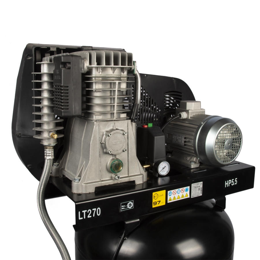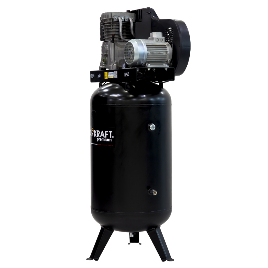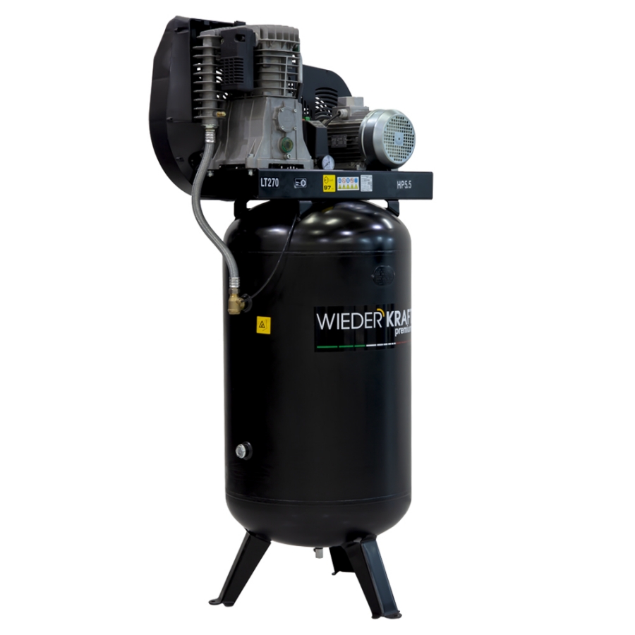 Масляный поршневой компрессор с ременным приводом и вертикальным расположением ресивера WiederKraft WDK-92760, который обеспечивает производительность 606 л/мин. Данная модель относится к классу профессионального оборудования и используется в случаях, когда требуется подача большого объема воздуха на длительное время. Применяется на автосервисах и СТО, дерево- и металлообрабатывающих производствах, а также при выполнении покрасочных работ. Компрессор имеет большой объем (270 л) и дополнительное давление в ресивере, что увеличивает запас воздуха. Устройства контроля и управления расположены в одном узле, что делает использование агрегата удобным. Ременной привод позволяет расположить компрессорную головку максимально эргономично, что значительно упрощает комбинацию с ресивером. Головка имеет дополнительные металлические ребра в конструкции, за счет чего увеличивается площадь теплоотдачи. Компрессор устанавливается на треногу, благодаря чему обеспечивается устойчивость аппарата во время работы. Вертикальный компрессор экономит рабочее пространство и отлично подходит для небольших помещений. В нижней части ресивера предусмотрен сливной клапан, позволяющий быстро избавиться от накопившегося за время работы агрегата конденсата. Высокую надежность и эффективность в работе обеспечивает ременная передача.