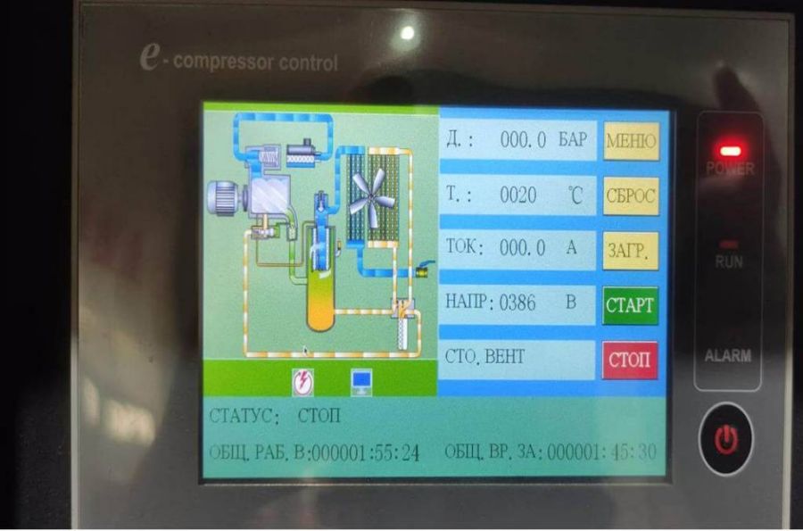 Винтовой компрессор MB 15-10 оснащен системой управления с сенсорным дисплеем, позволяющим в автоматическом режиме контролировать работу оборудования в режиме реального времени. Отличительной особенностью является полностью русифицированная программа управления.