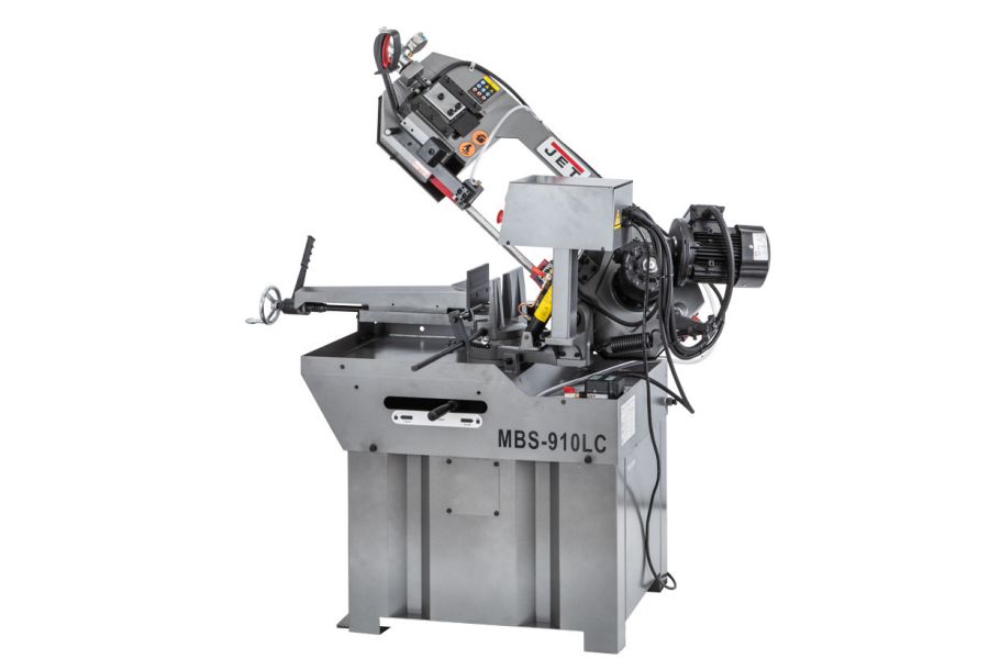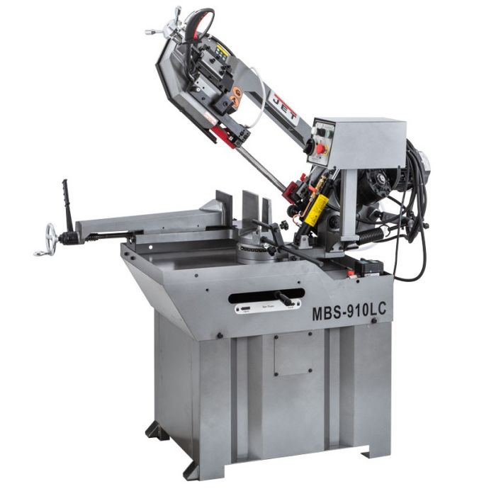 Ленточнопильный станок MBS-910LC представляет собой традиционную модель станков европейского типа, предназначенных для промышленного использования. Станок рассчитан на пиление круглых металлических заготовок под прямым углом максимально допустимого диаметра 227 мм. Особенности конструкции заключаются в возможностях поворота пильной рамы для обработки заготовок под разными углами. Угол поворота пильной рамы вправо составляет 60°. Максимальный диаметр заготовки для пиления под углом 45° составляет 150мм, при установке консоли под углом 60° – 90 мм. Станок MBS-910LC оборудован системой гидроразгрузки, с помощью которой осуществляется опускание консоли. Поднятие консоли обеспечивается оператором с помощью работы пружины–компенсатора. Наличие гидроцилиндра позволяет регулировать скорость подачи рамы в зону резания.