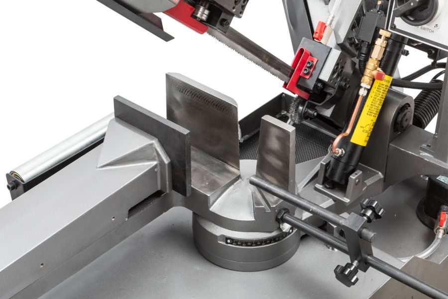 Ленточнопильный станок оборудован быстрозажимными тисками, используя которые можно добиться высокой производительности работ. Консоль станка имеет направляющие, передвижение которых позволяет регулировать проход ленточного полотна, повысить качество распила и ограничить уводку полотна в сторону. Направляющие оснащены подшипниками, выполняющими функцию позиционирования ленточного полотна в вертикальном положении относительно обрабатываемой заготовки. Станок имеет тензометр, фиксирующий силу натяжения ленточного полотна. Регулировка силы натяжения осуществляется вручную.