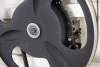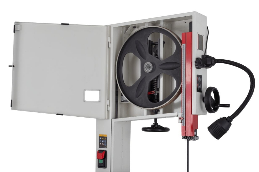 Натяжение ленты на колесах одним движением рычага. Большая ширина шкивов дает возможность установки широких пильных лент. Направление ленты при пилении двумя группами трехроликовых направляющих на шарикоподшипниках. Одна группа роликов расположена прямо над заготовкой и вторая – под столом. Стрелочный индикатор уровня натяжения поможет выбрать предварительный натяг пильной ленты. Отрегулировать натяжение до требуемого можно при помощи маховика на корпусе пилы под верхним/ведущим шкивом. Через смотровое окно необходимо проследить при первичной установке за сбеганием ленты. Лента должна находиться по центру и сбегание ее в любую из сторон недопустимо. Плавность хода и пиление без вибраций обеспечат чугунные шкивы с массивным телом. Они отбалансированы на заводе-изготовителе с использованием стендов компьютерной балансировки.