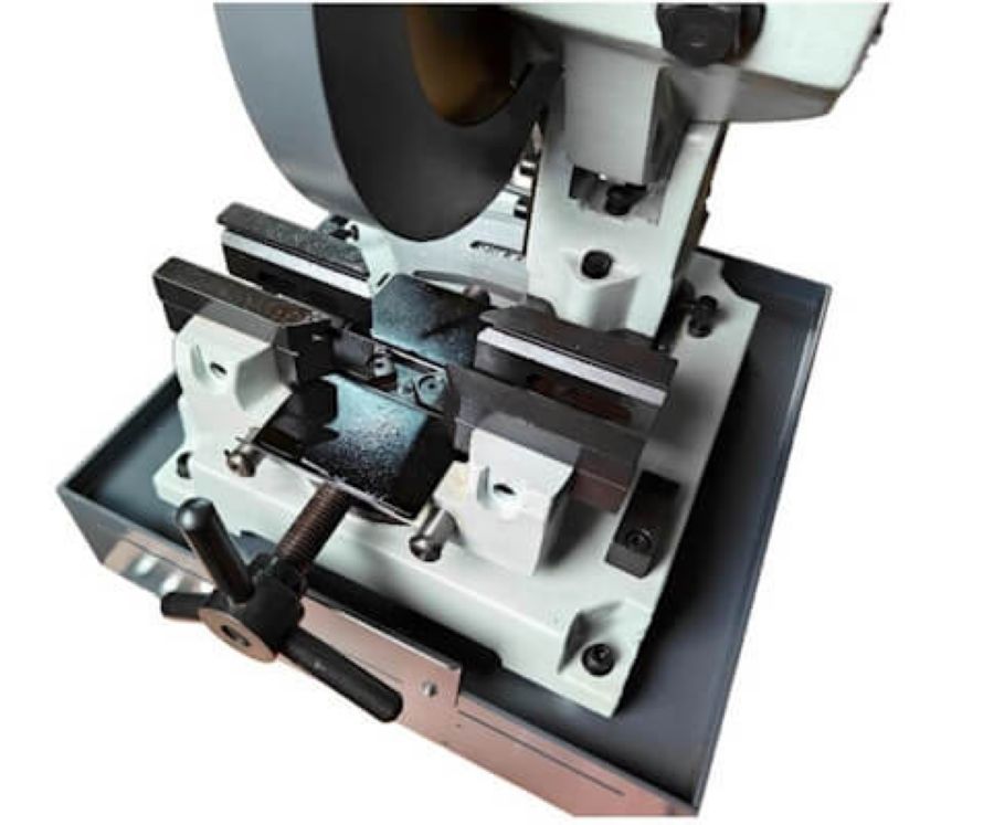 За надежное закрепление заготовки на станке отвечают механические тиски. Они приводятся в движение маховиком и надежно фиксируют заготовку. Губки тисков имеет специальные канавки, что препятствует самопроизвольному смещению заготовки при распиле.