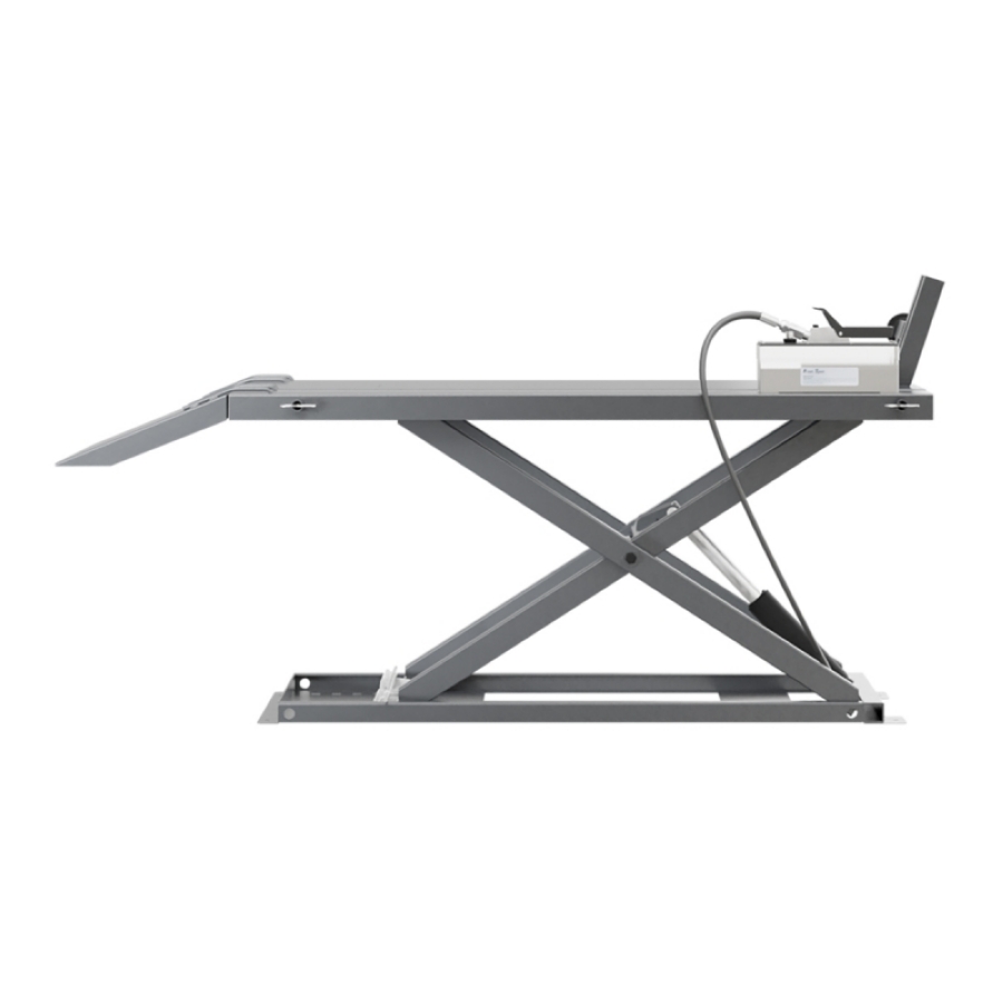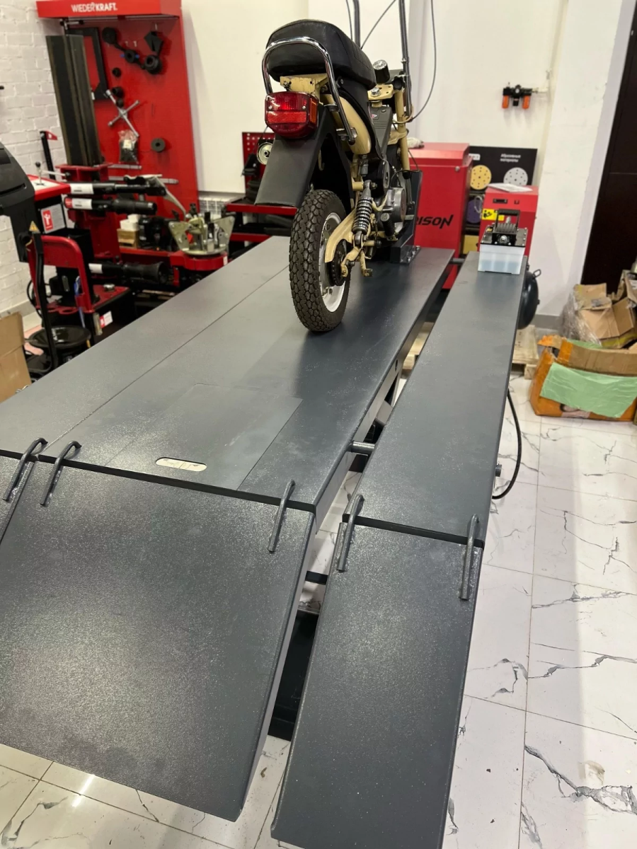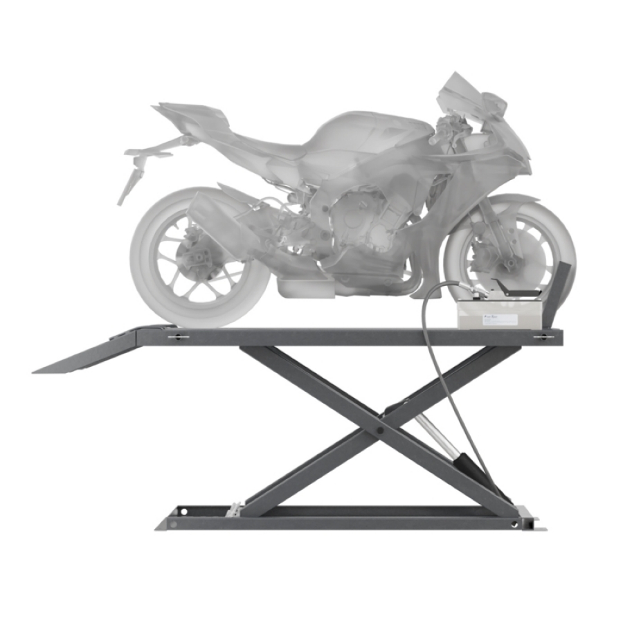 Подъемник пневмогидравлический 0,7 тонн для мототехники WiederKraft WDK-FC75W с дополнительными расширительными платформами позволяет проводить обслуживание и ремонт мотоциклов и квадроциклов весом до 700 кг. Мотоподъемник оснащен усиленным гидроцилиндром, обеспечивающим долговечность и надежность подъема и спуска. Привод гидроцилиндра осуществляется за счет пневмогидравлического насоса (в комплекте) На основной платформе предусмотрен специальный люк для демонтажа заднего колеса мотоцикла. Подъемник оснащен дополнительными платформами, увеличивающими общую ширину на 510 мм, которые устанавливаются сбоку от основной, что позволяет проводить обслуживание и ремонт ATV и UTV. Для фиксации мотоцикла на подъемнике предусмотрен механический регулируемый зажим с расширенным диапазоном захвата. Стопорная система представлена механическим стопором, надежно фиксирующим подъемник на необходимой для проведения работ высоте. Особенности и преимущества: