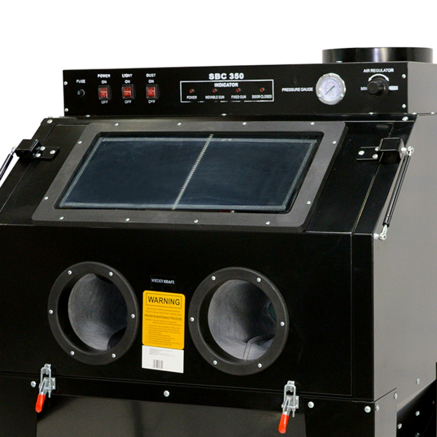 Напольная пескоструйная камера с фронтальной загрузкой WiederKraft WDK-83350 объемом 350 литров. Предназначена для обработки деталей/поверхностей в замкнутом пространстве воздушно-песчаной смесью, предотвращая распространение пыли за ее пределы. Позволяет эффективно очищать поверхности от ржавчины, окалины, формовочного грунта, слоев краски, заусенцев и сглаживать шероховатости. Данная камера работает от сжатого воздуха. Камера предусматривает увеличенную фронтальную загрузку с вертикальным подъемом двери при открытии. Такая конструкция позволяет поместить внутрь камеры тяжелые и громоздкие объекты любой формы. Встроенный светильник, изолированный от рабочей зоны, даёт ровное освещение, предотвращая появление «слепых зон» в рабочем пространстве. Рабочая панель оснащена предохранителем, выключателем питания, освещения и пылеуловителя, индикатором питания, закрытия дверей, подвижного инжектора, выключения неподвижного инжектора, а также манометром и регулятором давления воздуха. Большой объем камеры и возможность управлять потоком при помощи ножной педали упрощает обработку даже объемных и сложных деталей.