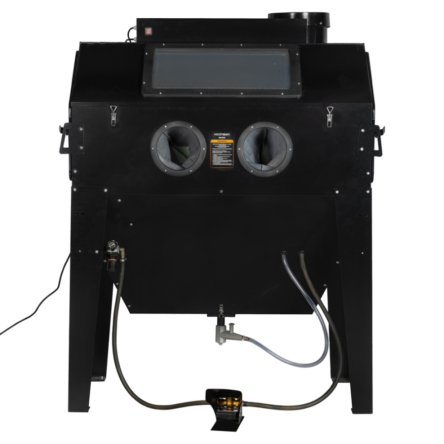 Важной особенностью камеры является рециркуляция абразива. Это позволяет значительно сократить расход обрабатывающего материала, а также уменьшить периодичность дозаправок резервуара. Частью базового комплекта поставки является вытяжной блок WDK-83353. Данный элемент создаёт внутри камеры замкнутую систему вентиляции, что позволяет работать с установкой в закрытых помещениях, без необходимости создания специальных условий. Помимо этого, вытяжной блок очищает рабочее пространство внутри камеры от облака песка и пыли.