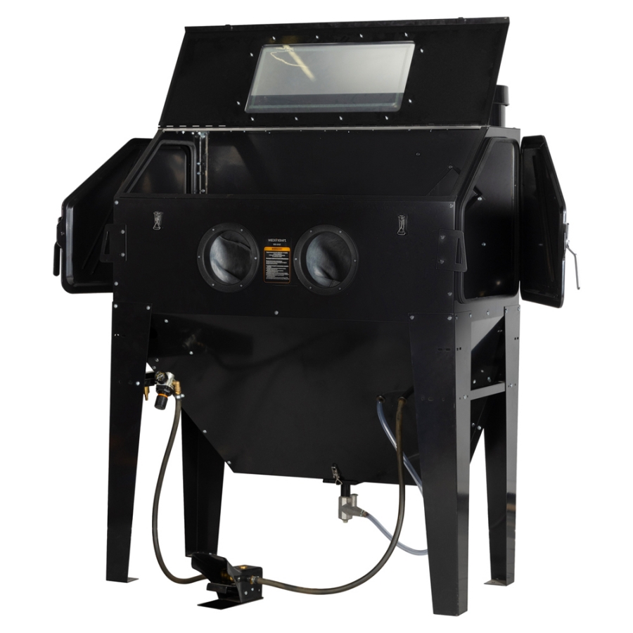 Напольная пескоструйная камера с боковой и фронтальной загрузкой WiederKraft WDK-83421 объемом 420 литров. Предназначена для обработки деталей/поверхностей в замкнутом пространстве воздушно-песчаной смесью, предотвращая распространение пыли за ее пределы. Позволяет эффективно очищать поверхности от ржавчины, окалины, формовочного грунта, слоев краски, заусенцев и сглаживать шероховатости. Данная камера работает от сжатого воздуха. Может использоваться в закрытом помещении без организации дополнительной рабочей площадки, так как имеет фильтр. Камера является комбинированной имеет как фронтальную, так и боковую загрузку. Такая конструкция позволяет поместить внутрь камеры тяжелые и громоздкие объекты любой формы. Модель WDK-83421 оснащена электропневматической системой управления, смотровым окном, осветительной лампой, перчатками из толстой резины. Наличие педали упрощает процесс обработки и позволяет постоянно удерживать деталь обеими руками. Широкие опорные ножки поглощают вибрации в процессе работы, обеспечивая высокую устойчивость оборудования. Корпус выполнен из металла высокой прочности.