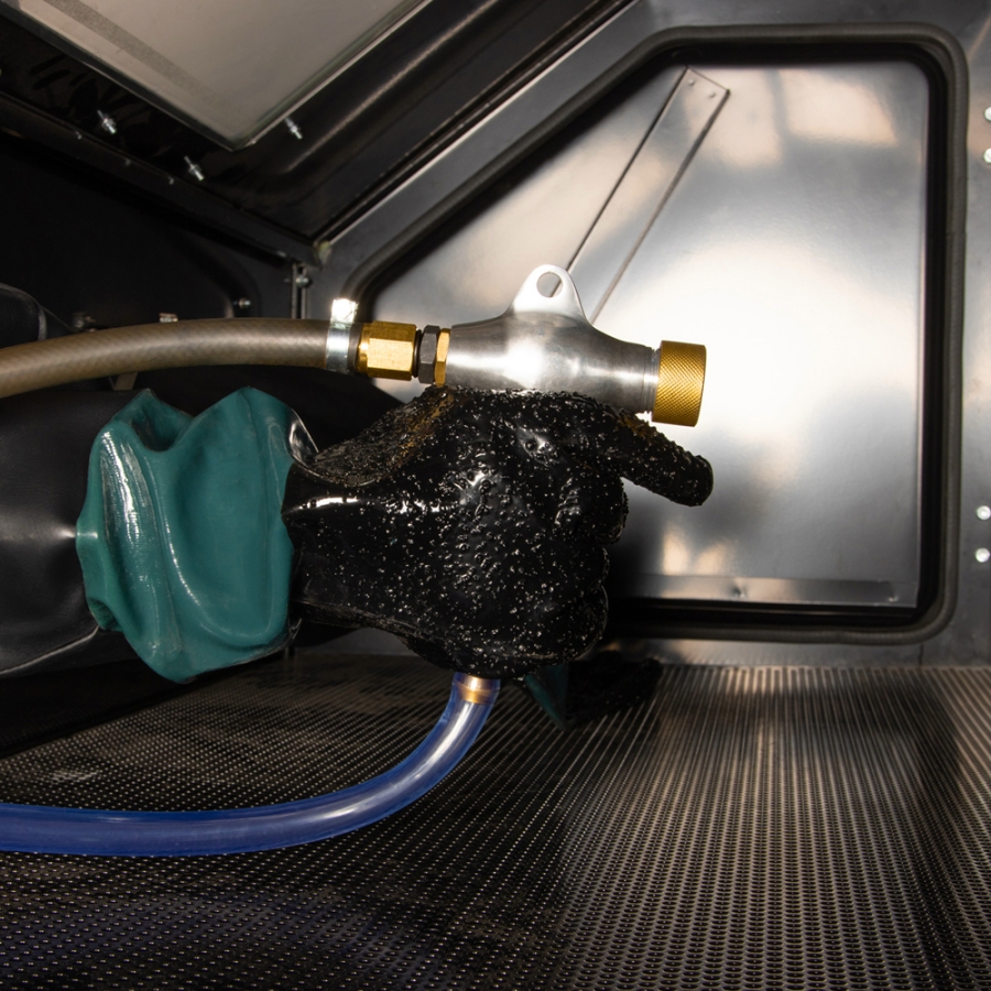 Оператор укладывает обрабатываемые изделия на решетчатый настил. Затем через специальные проемы, оснащенные перчатками из толстой резины, позиционирует абразивоструйное сопло и направляет абразиво-воздушную струю на обрабатываемую поверхность;