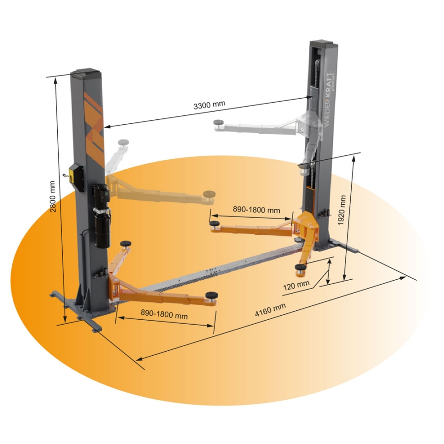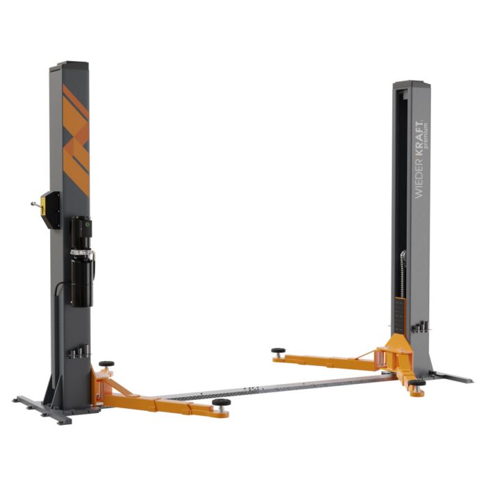 Двухстоечный подъемник с нижней синхронизацией WiederKraft WDK-524N грузоподъемностью 5000 кг. Отличается высокой надежностью конструкции: усиленный профиль подъемных кареток и лап, направляющие каретки из запатентованного полимера, стальные шкивы (сталь 45), стальные тросы 10 мм, толщина металла 6 мм. Управление стопорами с одной колонны экономит время при спуске автомобиля. Наличие концевого ограничителя подъема обеспечивает дополнительную безопасность во время эксплуатации подъемника. Конфигурация подъемника позволяет обслуживать все самые популярные типы автомобилей: от А-класса до микроавтобусов.