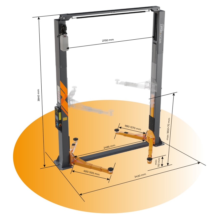 Двухстоечный подъемник с верхней синхронизацией и электромагнитной системой разблокировки WiederKraft WDK-529E грузоподъемностью 4000 кг. Отличается усиленной конструкцией элементов: шкивы увеличенного диаметра, толщина металла 6 мм (на 20% больше, чем у аналогичных моделей) — обеспечивает жесткость и устойчивость колонн подъемника. Увеличенная длина подъемных лап (3-секционные — 600-1105 мм; 2-секционные — 980-1570 мм) позволяет обслуживать коммерческий транспорт и обеспечивает устойчивость автомобиля во время проведения работ. Управление стопорами с пульта на колонне экономит время при спуске автомобиля. Штатные внутренние защитные кожухи надежно защищают гидравлическую магистраль и электрические кабели от повреждений. Лапы с усиленным профилем каретки обеспечивают жесткость опорной системы лап. Элементы гидравлики и троса разблокировки надежно защищены двойным трапом, плотно входящим в пазы опор стоек. Гидравлические парашютные клапаны препятствуют резкому спуску автомобиля при механическом повреждении гидравлической системы подъемника, блокируя поток гидравлического масла из гидроцилиндров.