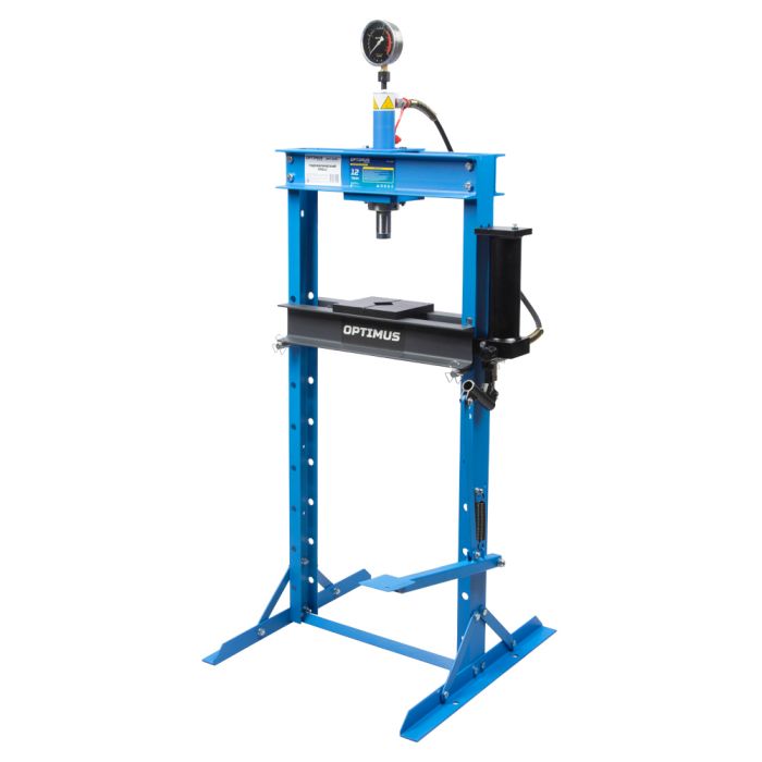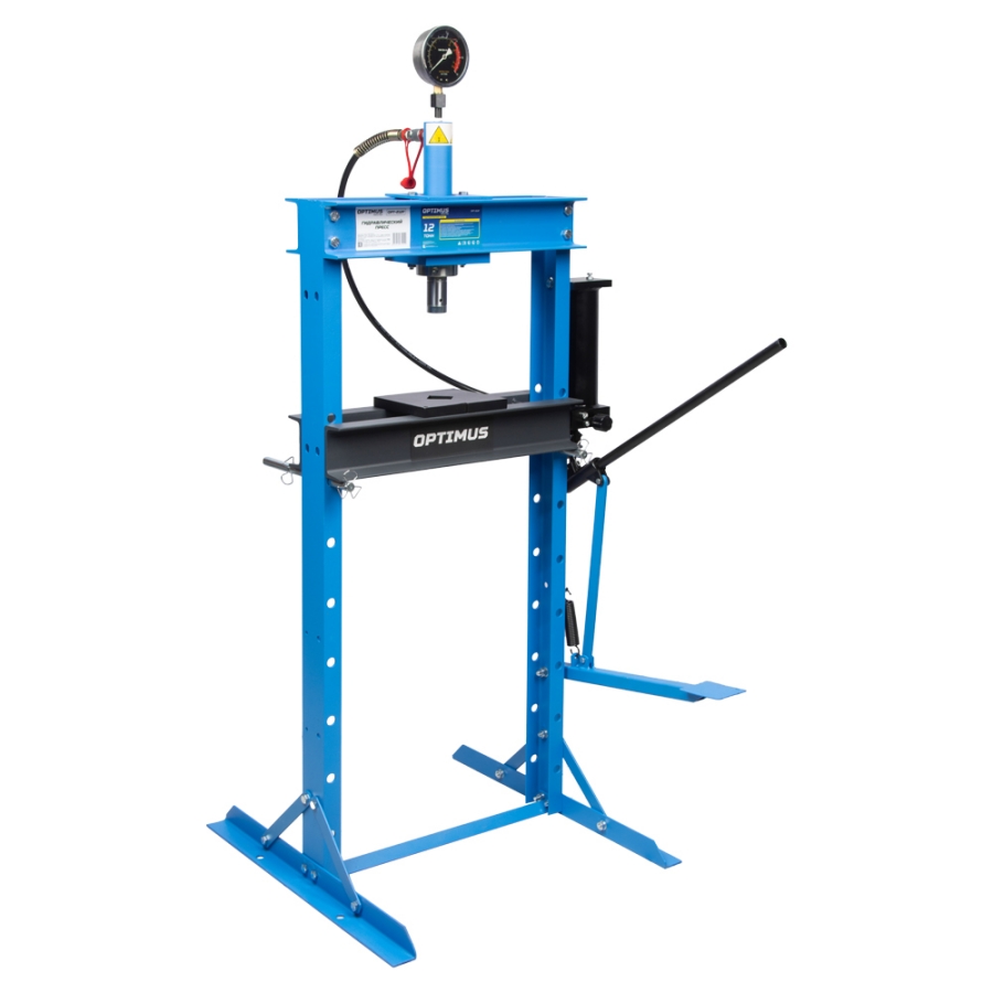 Напольный гидравлический пресс OPTIMUS OPT-212F, оснащенный ручным и ножным приводом и обеспечивающий усилие в 12000 кг. Используется в автосервисах, СТО и производстве для запрессовки деталей различных размеров, выпрессовки втулок, снятия и установки подшипников, гибки металла. Жидкостный манометр, защищенный от гидроудара, упрощает контроль за развиваемым усилием. Рабочий стол легко и просто регулируется по высоте от 225 до 1060 мм, что позволяет устанавливать детали различных габаритов. Цилиндр имеет возможность горизонтального перемещения для работы по всей плоскости стола. Жесткая и прочная сварная рама обеспечивает долговечность оборудования даже при интенсивной эксплуатации.