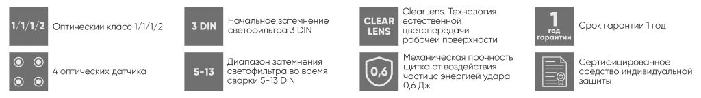 Увеличенный размер смотрового окна 98*88 мм, 4 датчика чувствительности, система изменения диапазона затемнения 5-8 9-19 DIN.