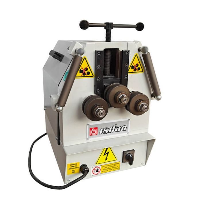 Профилегиб электромеханический ISITAN PK-20 предназначен для гибки профильных, квадратных труб и полосы, а также круглых труб и сортового проката в холодном состоянии – методом прокатки. Станок находит применение на предприятиях мелко-и среднесерийного производства. Станок оборудован электрическим двигателем с потребляемой мощностью 0,37 кВт, который через редуктор приводит в действие два нижних приводных вала. Мотор обеспечивает скорость вращения 15 метров в минуту.