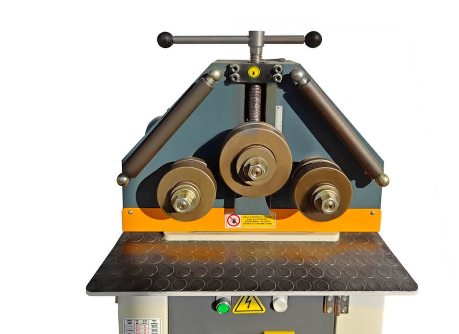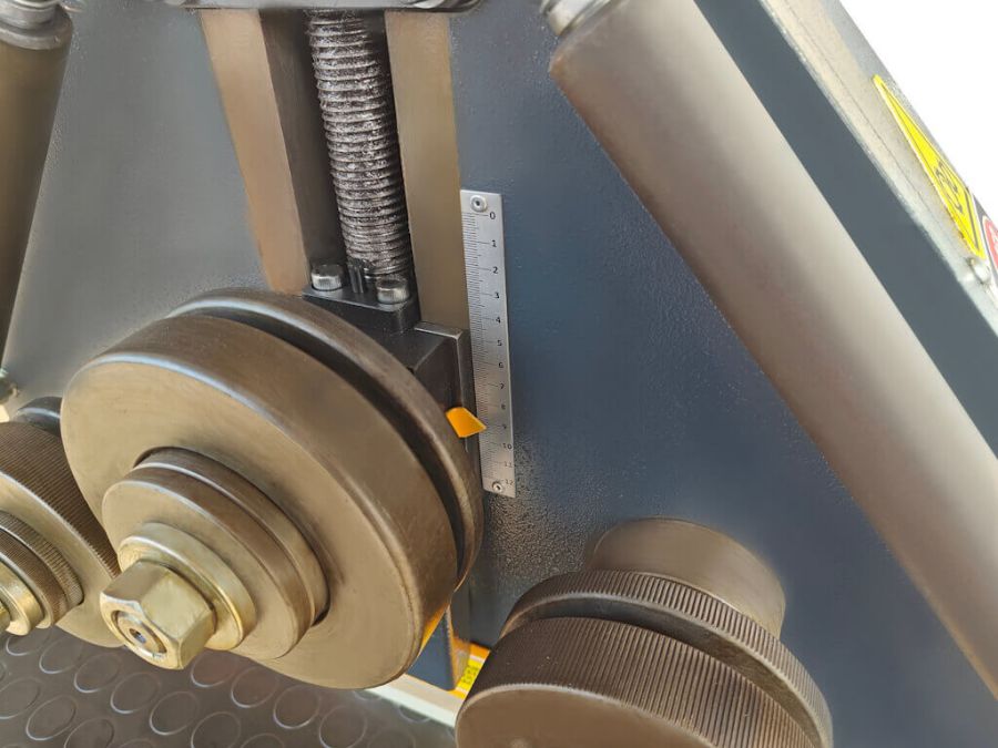 С фронтальной стороны гибочной головы расположены два приводных и один гибочный ролик. Регулировка положения гибочного ролика осуществляется с помощью вращения рукоятки и шкалы повторяемости.