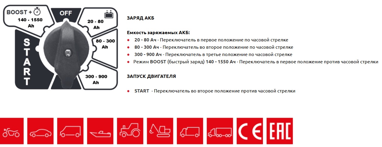 ЗАПУСК - Позволяет произвести запуск всех типов легковых автомобилей, фургонов и легких грузовых автомобилей током до 570 А.