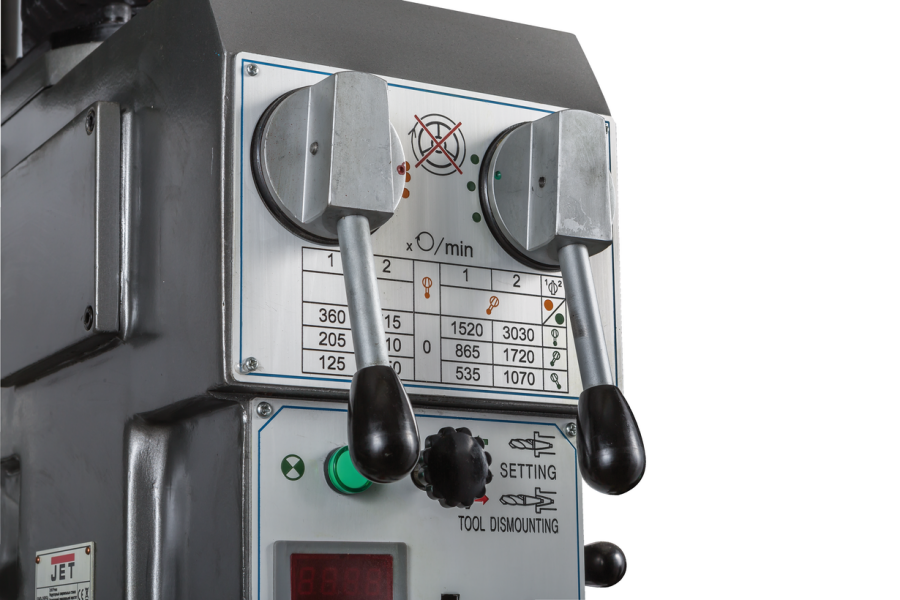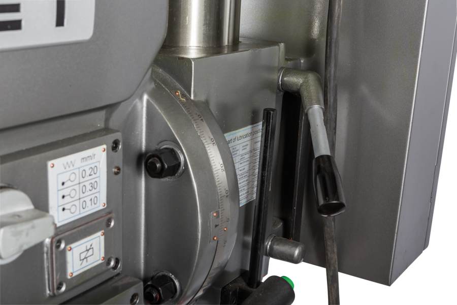 Редукторный сверлильный станок JET GHD-35PFA с максимальным диаметром сверления по стали 35 мм, предназначен для работы в ремонтных и инструментальных цехах, а также в производственных цехах с мелкосерийным выпуском продукции; оснащенный приспособлениями станок может быть применен в массовом производстве.