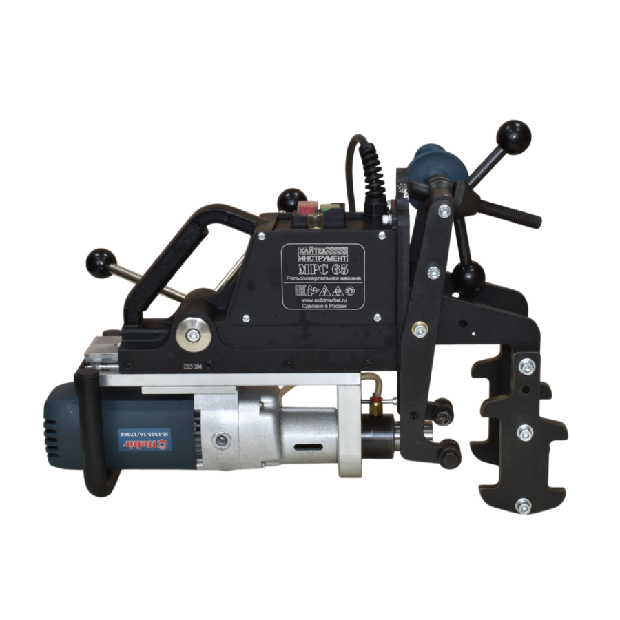 Предназначена для просверливания отверстий под стыковые и соединительные болты в различных рельсах. Рабочим инструментом являются корончатые сверла (большая производительность и меньшее энергопотребление). Для машины походит большинство производимых мировой промышленностью рельсовых сверл с хвостовиком Weldon ? (19,05 мм). Мощность двигателя и диапазон частоты вращения шпинделя обеспечивают быстрое и надежное сверление отверстий в объемно-закаленных рельсах. Конструкция крепления позволяет быстро устанавливать и снимать машину на рельс сверху, без необходимости удаления балласта. Входящий в комплект кронштейн упорный с шаблоном обеспечивает требуемую по ГОСТ Р 51685-2000 высоту расположения отверстий на рельсах Р50 , Р65(Р75) . В отличие от бензиновых, станок МРС-65 не выделяет выхлопных газов при работе и идеален в применении в тоннелях и замкнутых пространствах.