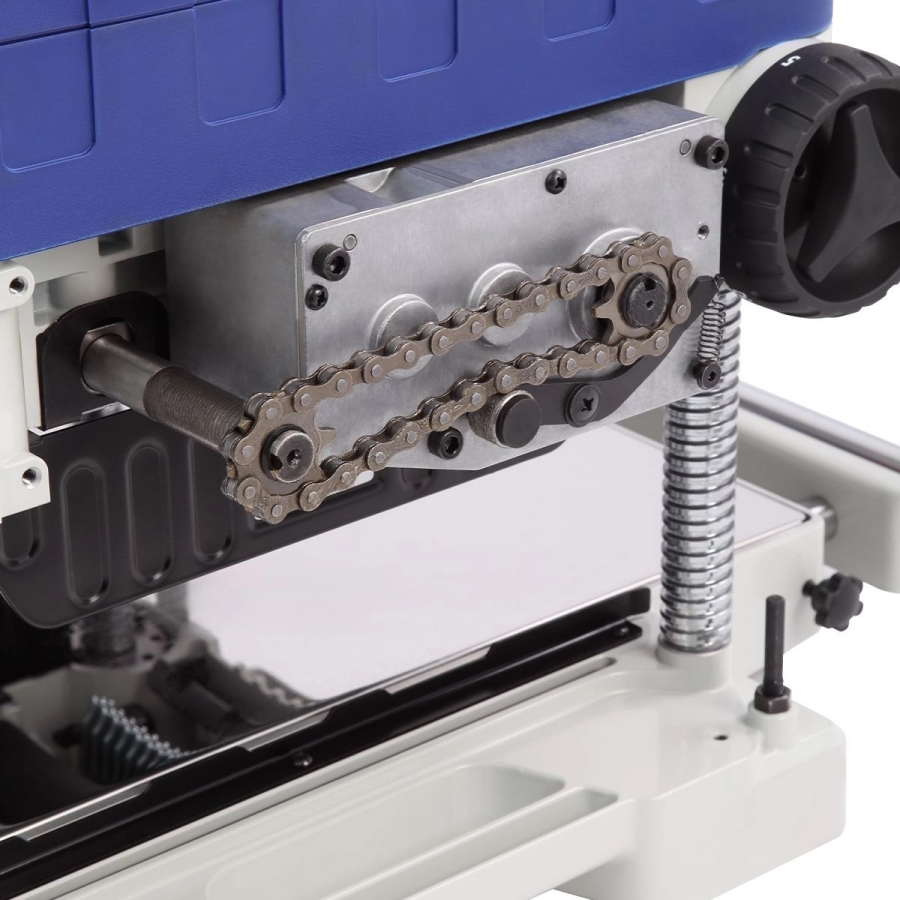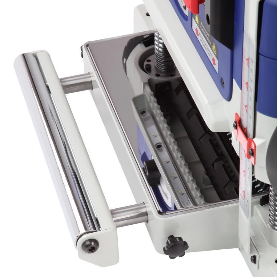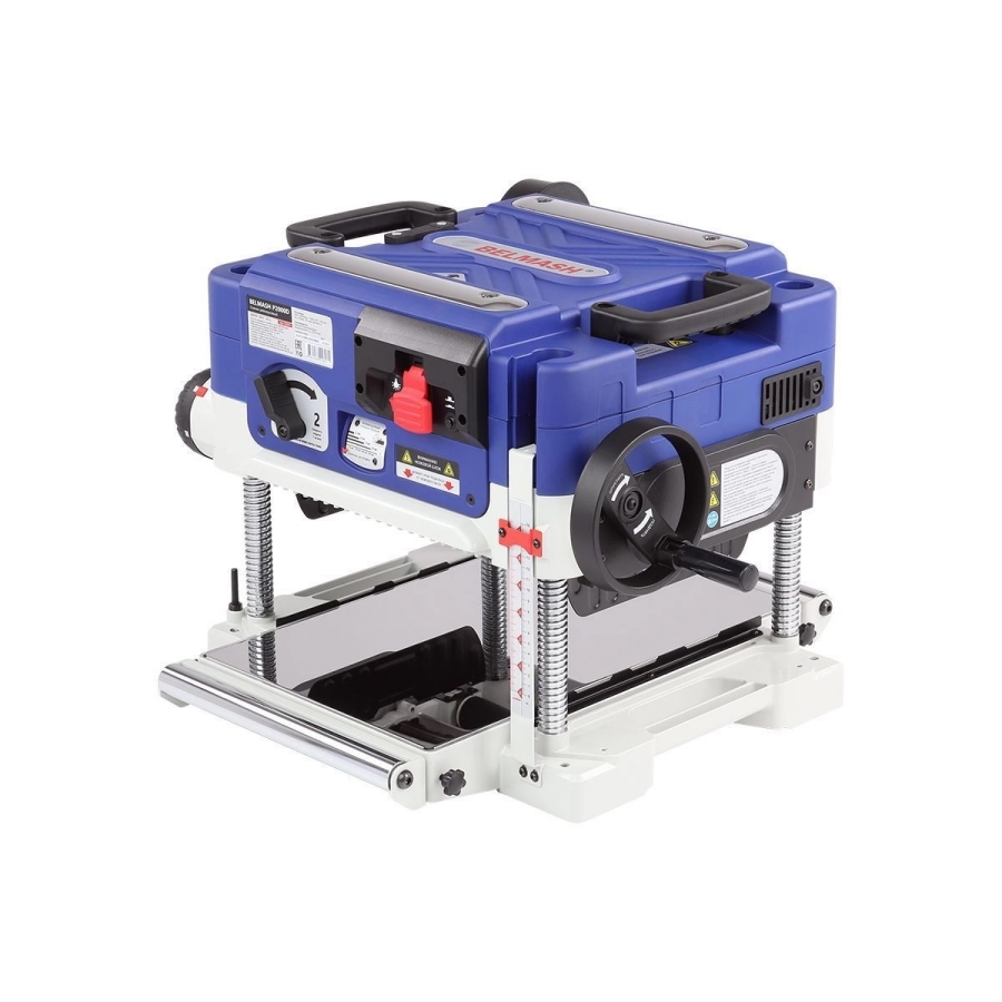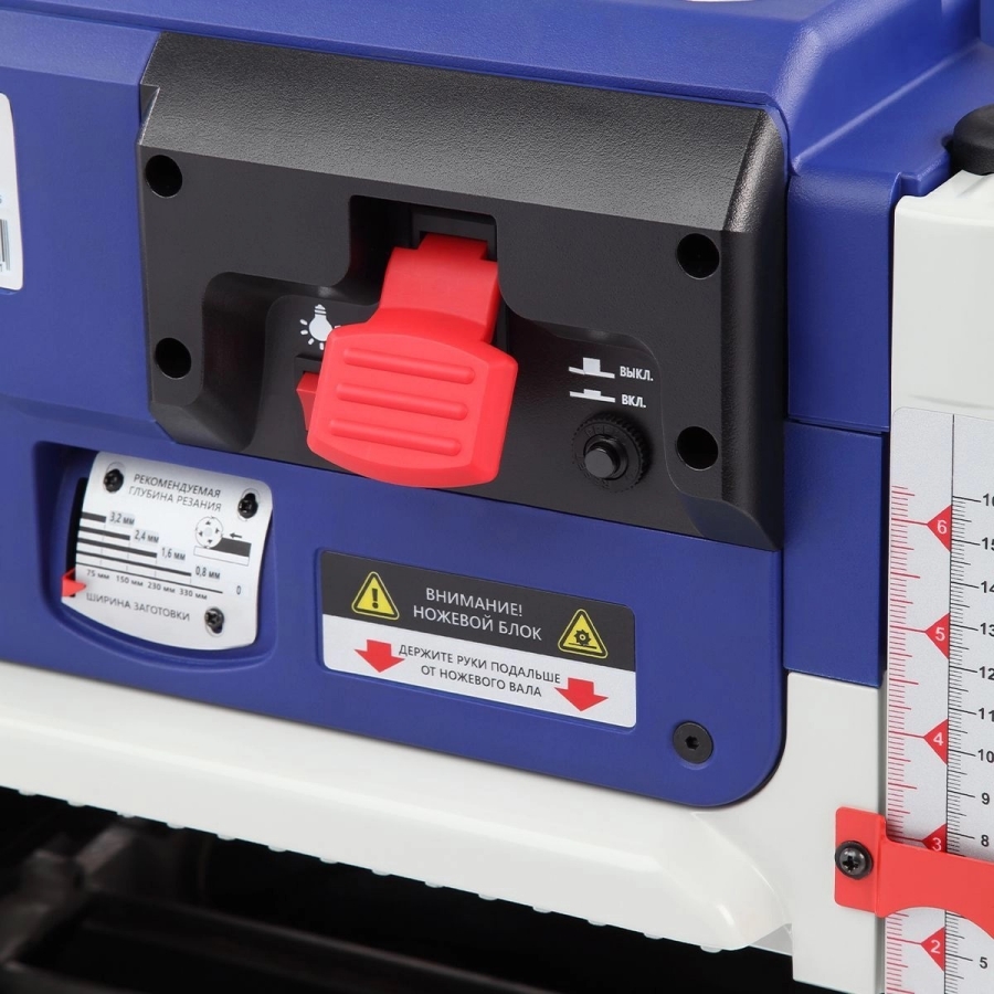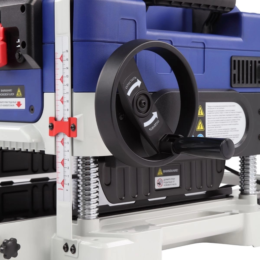 - Регулировка высоты рабочей платформы осуществляется поворотом маховика с диапазоном от 5 до 152 мм. Для точной настройки предусмотрена шкала глубины строгания и ограничитель высоты с фиксацией на 5, 10, 18, 20, 25 и 30 мм. Это позволяет быстро устанавливать нужную толщину обработки и повторять параметры для серийных деталей.