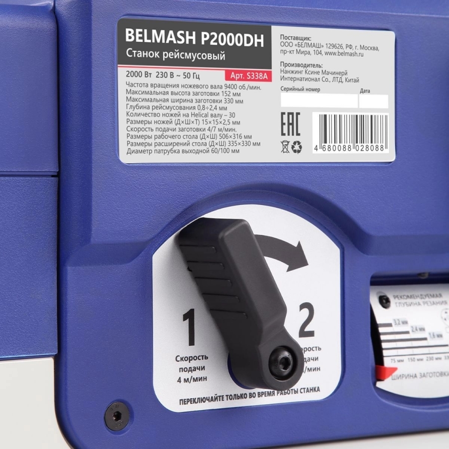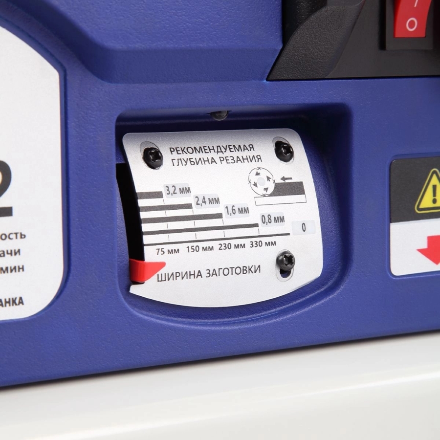 - Максимальная ширина заготовки составляет 330 мм. Глубина рейсмусования за один проход от 0,8 до 3,2 мм, чем шире заготовка, тем меньше глубина съёма.