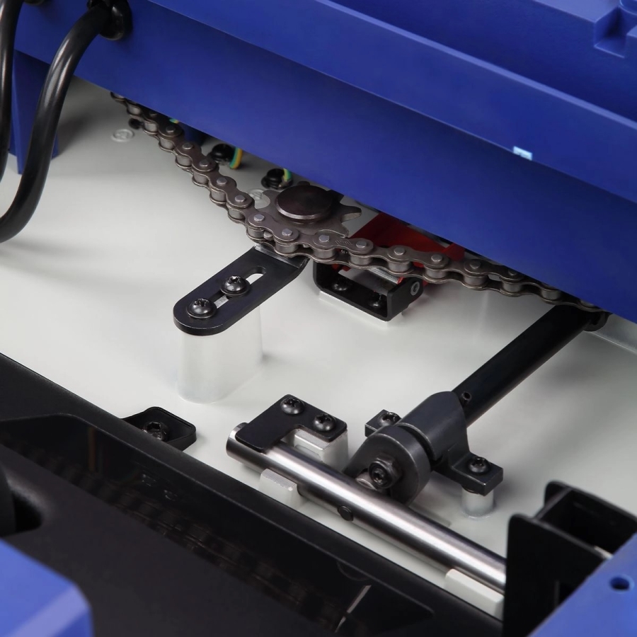 - Автоматическая подача материала осуществляется двумя стальными валами с резиновым покрытием на скорости 4 или 7 м/мин. Резиновое покрытие обеспечивает надежный захват заготовки без повреждения поверхности. Для удобства работы с длинными заготовками предусмотрены выдвижные ролики размером 335х330 мм, которые поддерживают материал и облегчают работу.
