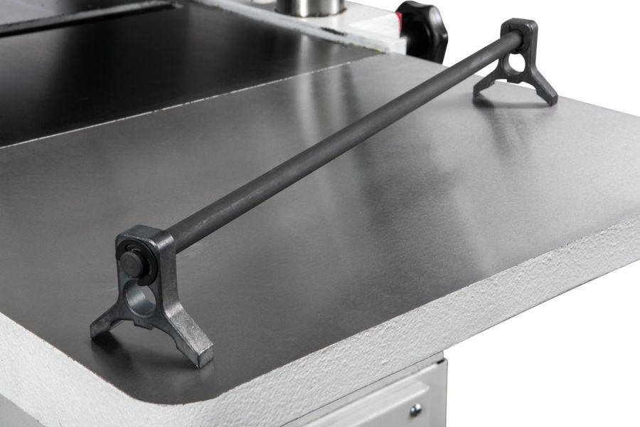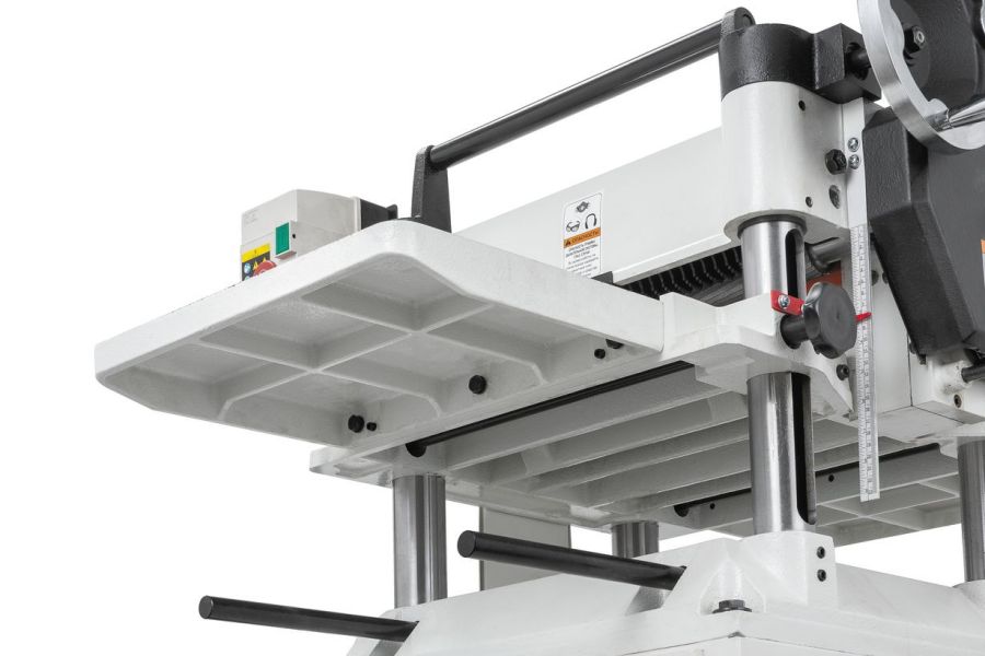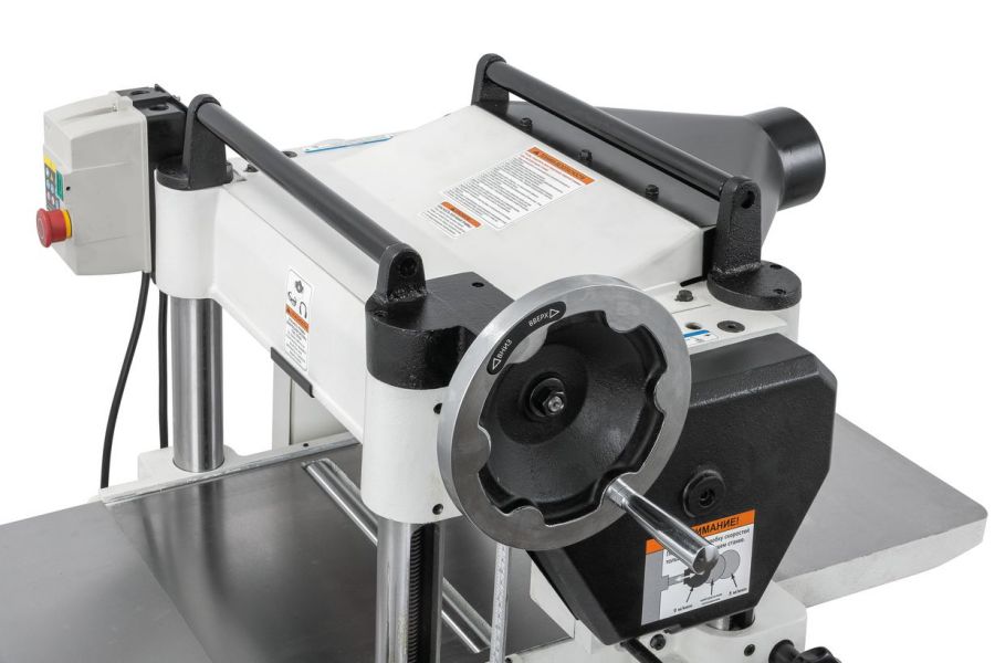 JWP-15K — рейсмусовый станок с прочной и массивной конструкцией, предназначенный для профессиональной и любительской эксплуатации. Рабочий стол, его удлинения, основание и строгальный узел сделаны из чугуна. Регулировка просвета происходит при подъеме и опускании стола, в нижнем положении расстояние до ножей превышает 200 мм, что позволяет пропускать крупные брусья или доски, поставленные на ребро.