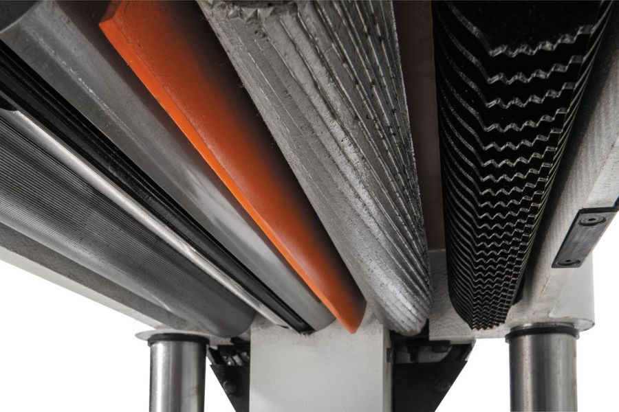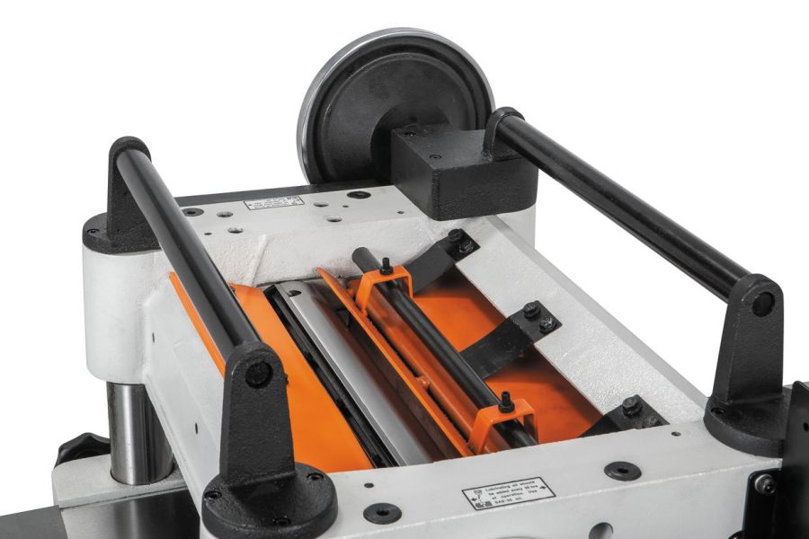 Мотор расположен внизу в тумбе и не занимает верхнюю часть корпуса, это позволило установить два металлических ролика для обратной подачи заготовок и обеспечить удобный доступ к строгальному валу для замены и регулировки ножей. В штатной комплектации установлен барабан с тремя прямыми лезвиями. Для интенсивной эксплуатации, при частой работе с твердыми и свилеватыми породами, при повышенных требованиях к качеству обработки рекомендуется приобрести и установить вал helical, имеющий 75 четырехсторонних твердосплавных сегмента с радиусной режущей кромкой.