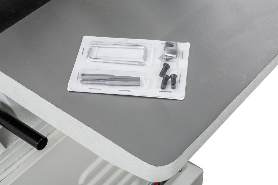 Сверху направляющих колонн установлено два металлических ролика для обратной подачи заготовок. Рабочий стол станка, его удлинения, основание и строгальный узел сделаны из чугуна. Регулировка просвета происходит при подъеме и опускании стола, в нижнем положении расстояние до ножей превышает 200 мм, что позволяет пропускать крупные брусья или доски, поставленные на ребро.