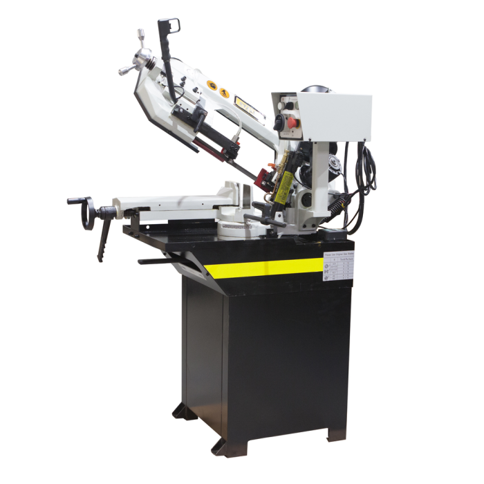 Модель имеет быстрорегулируемые тиски для резки под углом, поворачивается рама, а не заготовка. Тиски с системой быстрого отвода ускоряют процесс смены заготовки (ускоренный отвод подвижной губки происходит без вращения маховика). Зажим заготовки осуществляется тисками вручную, подача заготовки - также вручную. Наличие системы СОЖ в стандартной комплектации – позволяет добиться высокой производительности.