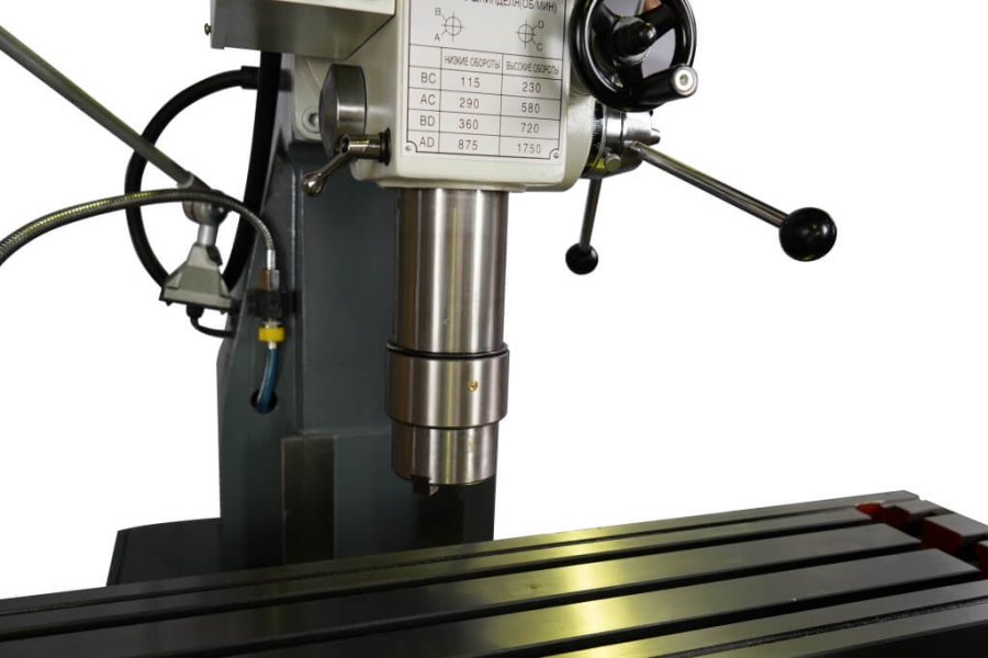 Шпиндель снабжен звездчатой рукояткой быстрой подачи пиноли, а так же переключателем на микрометрическую подачу. Маховик микрометрической подачи оснащен нониусом.