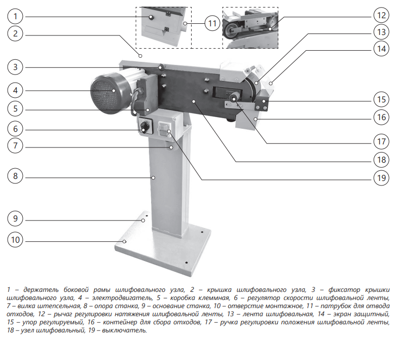 Для удобства использования, на опоре станка расположен блок выключателя с ручкой регулировки скорости движения шлифовальной ленты.