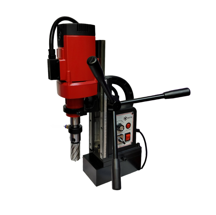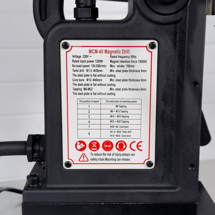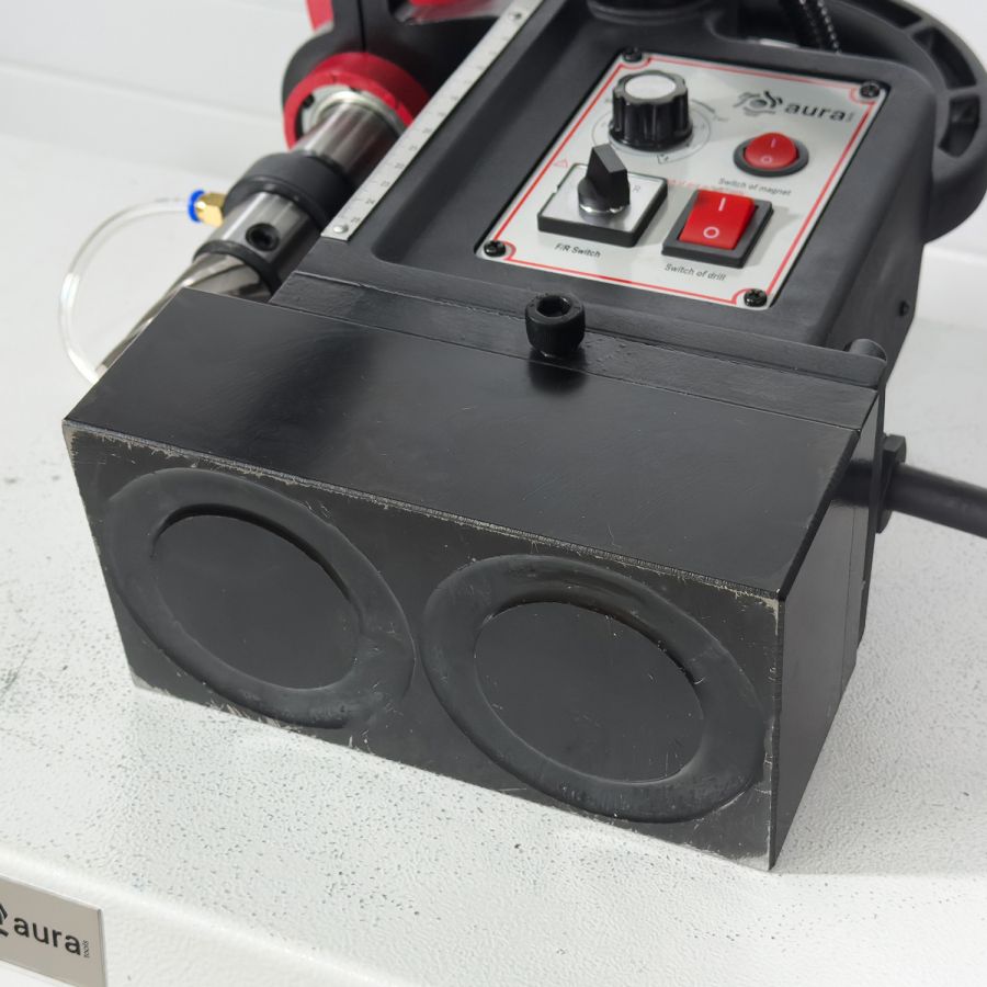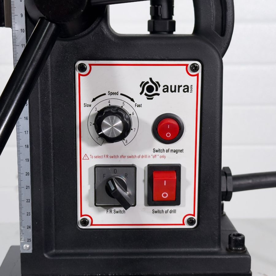 Переносной магнитный сверлильный станок AURA MCM-40 предназначен для промышленного использования, сверления отверстий до 40 мм корончатым сверлом и до 28 мм спиральным сверлом в различных сталях. Станок оснащен реверсом и позволяет нарезать резьбы до М22. Мобильность, надёжный электродвигатель мощностью 1200 Вт и массивное поворотное магнитное основание, имеющее силу притяжения 15000 H, обеспечивают уверенность в выполнении самых сложных задач. Машина имеет функцию плавной регулировки оборотов в диапазоне от 120 до 550 об/мин., что позволяет точнее выбрать режим обработки, а использование имеющейся системы подачи СОЖ в зону резания, исключит перегрев режущего инструмента и продлит срок его службы. Для более точного позиционировании на закрепляемой поверхности, предусмотрена возможность смещения станины относительно закрепленного магнитного основания в диапазоне 20 мм. Безопасность работы с станком обеспечивает прочный страховочный ремень, входящий с комплект поставки. Ремнем станок фиксируется к балке или конструкции на которой он установлен, что препятствует падению машины при аварийном отключении электроэнергии