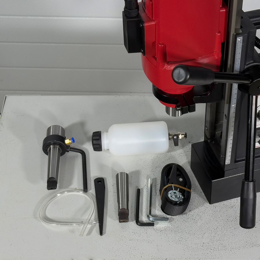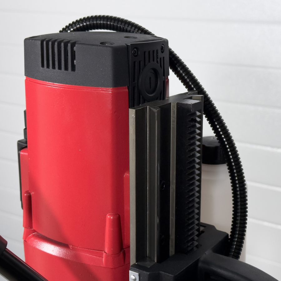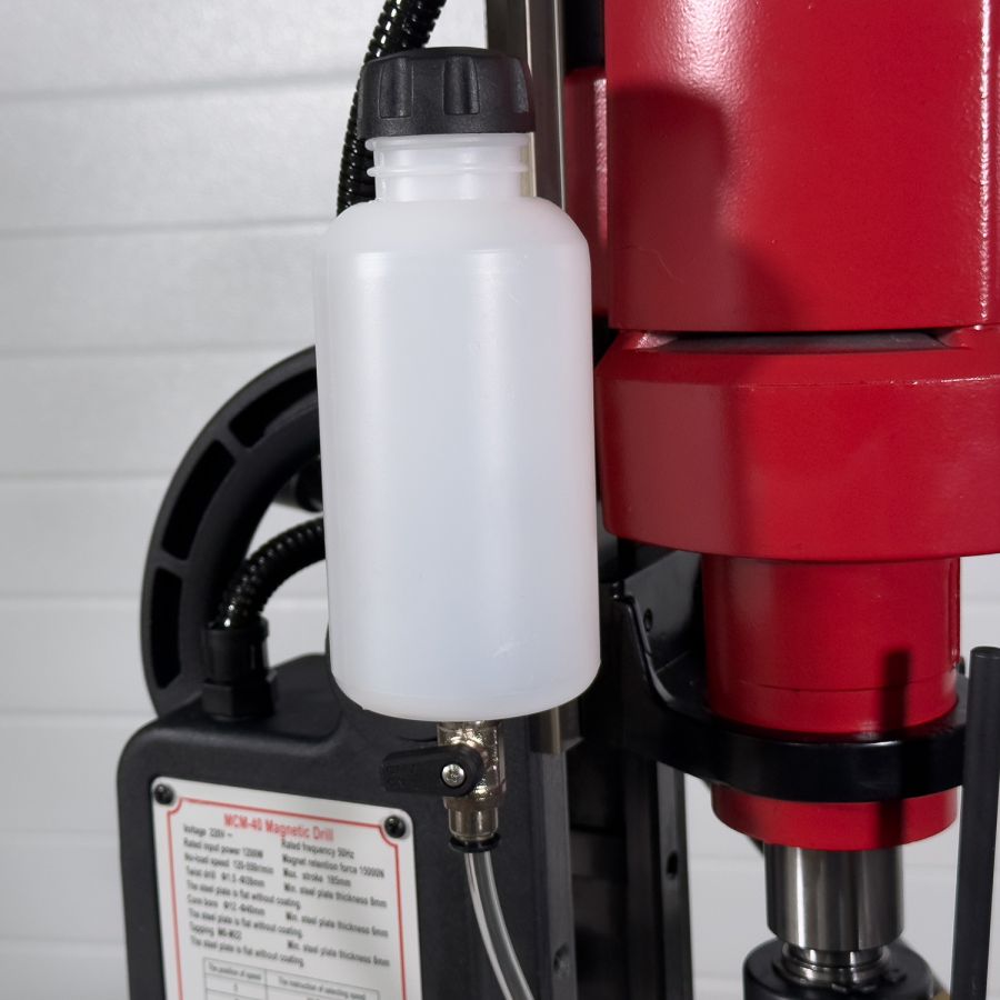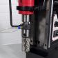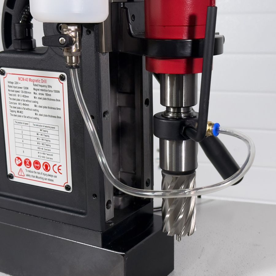 Переносной магнитный сверлильный станок AURA MCM-40 предназначен для промышленного использования, сверления отверстий до 40 мм корончатым сверлом и до 28 мм спиральным сверлом в различных сталях. Станок оснащен реверсом и позволяет нарезать резьбы до М22. Мобильность, надёжный электродвигатель мощностью 1200 Вт и массивное поворотное магнитное основание, имеющее силу притяжения 15000 H, обеспечивают уверенность в выполнении самых сложных задач. Машина имеет функцию плавной регулировки оборотов в диапазоне от 120 до 550 об/мин., что позволяет точнее выбрать режим обработки, а использование имеющейся системы подачи СОЖ в зону резания, исключит перегрев режущего инструмента и продлит срок его службы. Для более точного позиционировании на закрепляемой поверхности, предусмотрена возможность смещения станины относительно закрепленного магнитного основания в диапазоне 20 мм. Безопасность работы с станком обеспечивает прочный страховочный ремень, входящий с комплект поставки. Ремнем станок фиксируется к балке или конструкции на которой он установлен, что препятствует падению машины при аварийном отключении электроэнергии